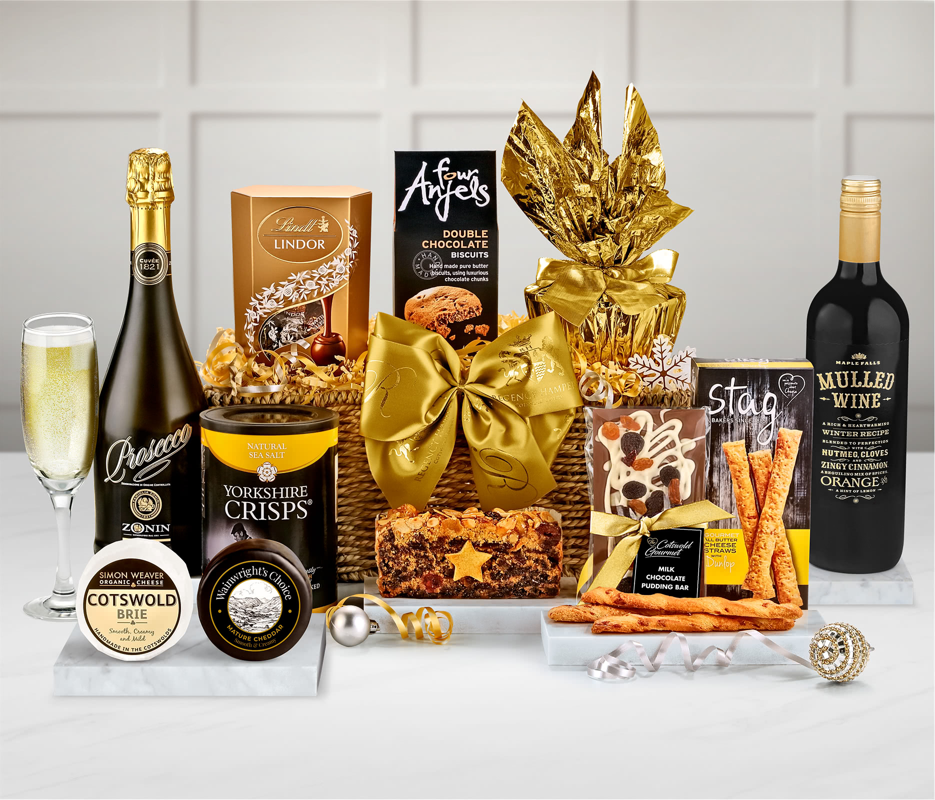 Artisan Cheese & Gourmet Treats: Savour exquisite British cheeses, including Simon Weaver's Organic Single Gloucester and Wainwright's Vintage Mature Cheddar, complemented by Yorkshire crisps and Arden's cheese twists. Sweet delights include Lindt truffles, double chocolate biscuits, and traditional Christmas pudding with an accompanying chocolate bar.