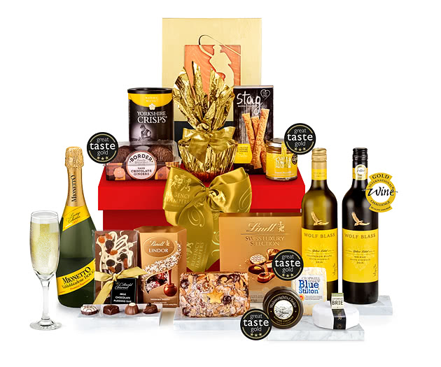 Artisan British Cheese & Gourmet Treats: For nibbles, we've included British cheeses like Cropwell Bishop Blue Stilton and a mature Cheddar, alongside Yorkshire crisps, smoked salmon, and piccalilli. You'll also find Lindt chocolates, a Christmas pudding, and many more tastes of luxury UK produce.