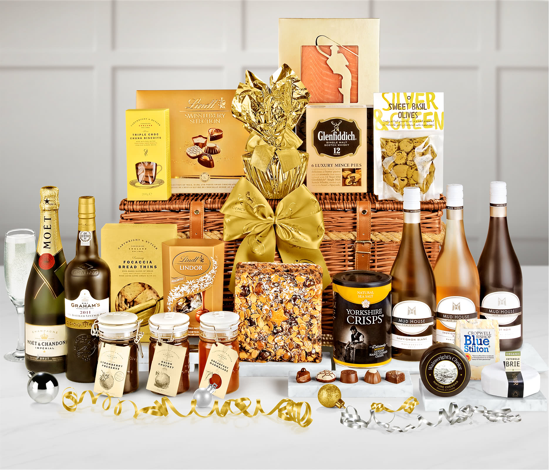 Exquisite Artisan Foods: Indulge in luxury British cheeses, including Blue Stilton, Cotswold Brie, and Vintage Mature Cheddar, paired with premium smoked salmon and gourmet accompaniments. Sweet treats abound with a 1kg jewel-topped fruit cake, Glenfiddich mincemeat tarts, traditional Christmas pudding, and Lindt Swiss chocolates.