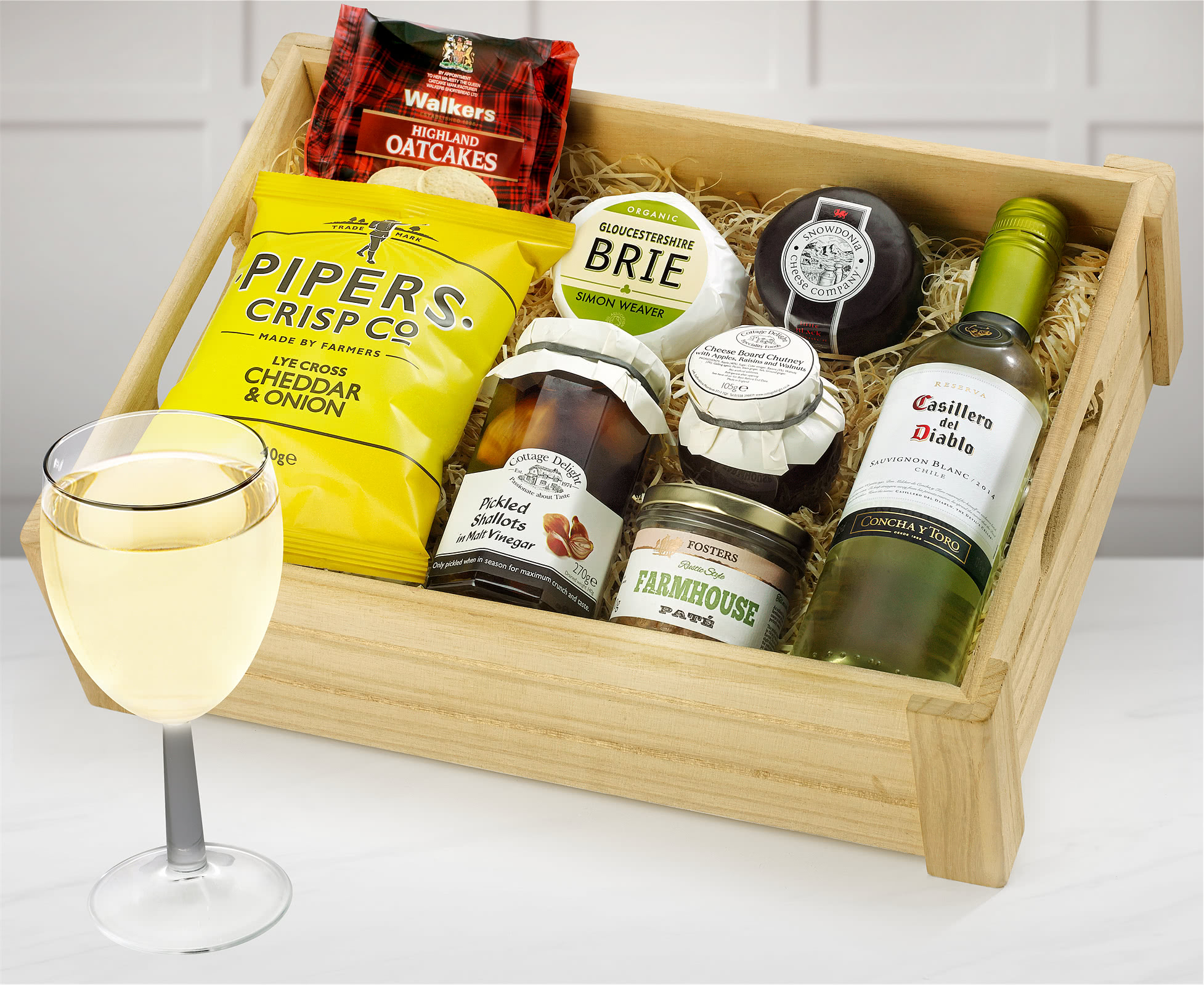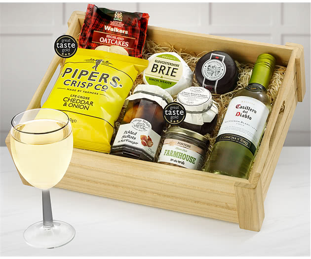 This refined Ploughman's Choice Crate contains a fine bottle of Chilean Casillero del Diablo Sauvignon Blanc White Wine together with Snowdonia Extra Mature Cheddar, Simon Weaver's Organic Cotswold Brie and Cottage Delight's Farmhouse Pate with Pork. And to complete this Ploughman's Crate we add Cheeseboard Chutney, Pipers Cheddar & Onion Crisps and sharp Pickled Shallots in Malt Vinegar.