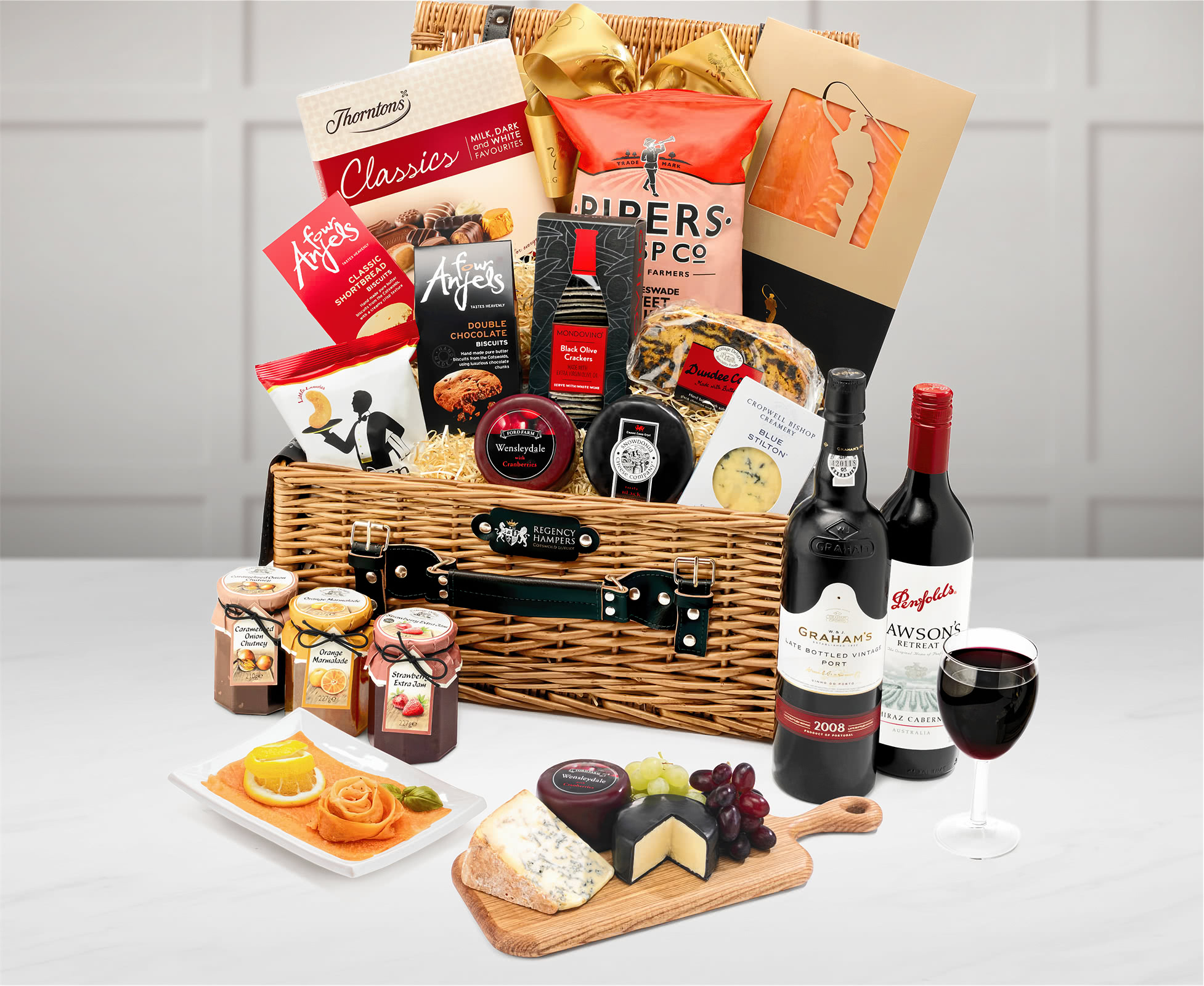 This elegant wicker picnic hamper contains those classic gifts of Port and Stilton and so much more, including two further great British cheeses and delicious Premium Smoked Salmon from the Severn & Wye Smokery. So, in addition to a fine bottle of Graham's Late Bottled Vintage Port and an exceptional Cropwell Bishop Blue Stilton you can enjoy Snowdonia Select Extra Mature Cheddar and a Yorkshire Wensleydale with Cranberries. Further savoury treats include Cottage Delight's Caramelised Onion Chutney, Spicy Moroccan Seed & Nut , Chili & Lime Cashews from The Dormen and Biggleswade Sweet Chili Crisps. Four Anjels provide Double Chocolate Biscuits and Cotswold Luxury Shortbread while Cottage Delight offer up their Strawberry Extra Jam and Thin Cut Orange Marmalade together with a Luxury Dundee Cake. As a further sweet treat, this Traditional Port and Stilton Hamper contains a box of delicious Thornton's Classic Chocolates. As this gift hamper contains alcohol it is not suitable for under 18s.