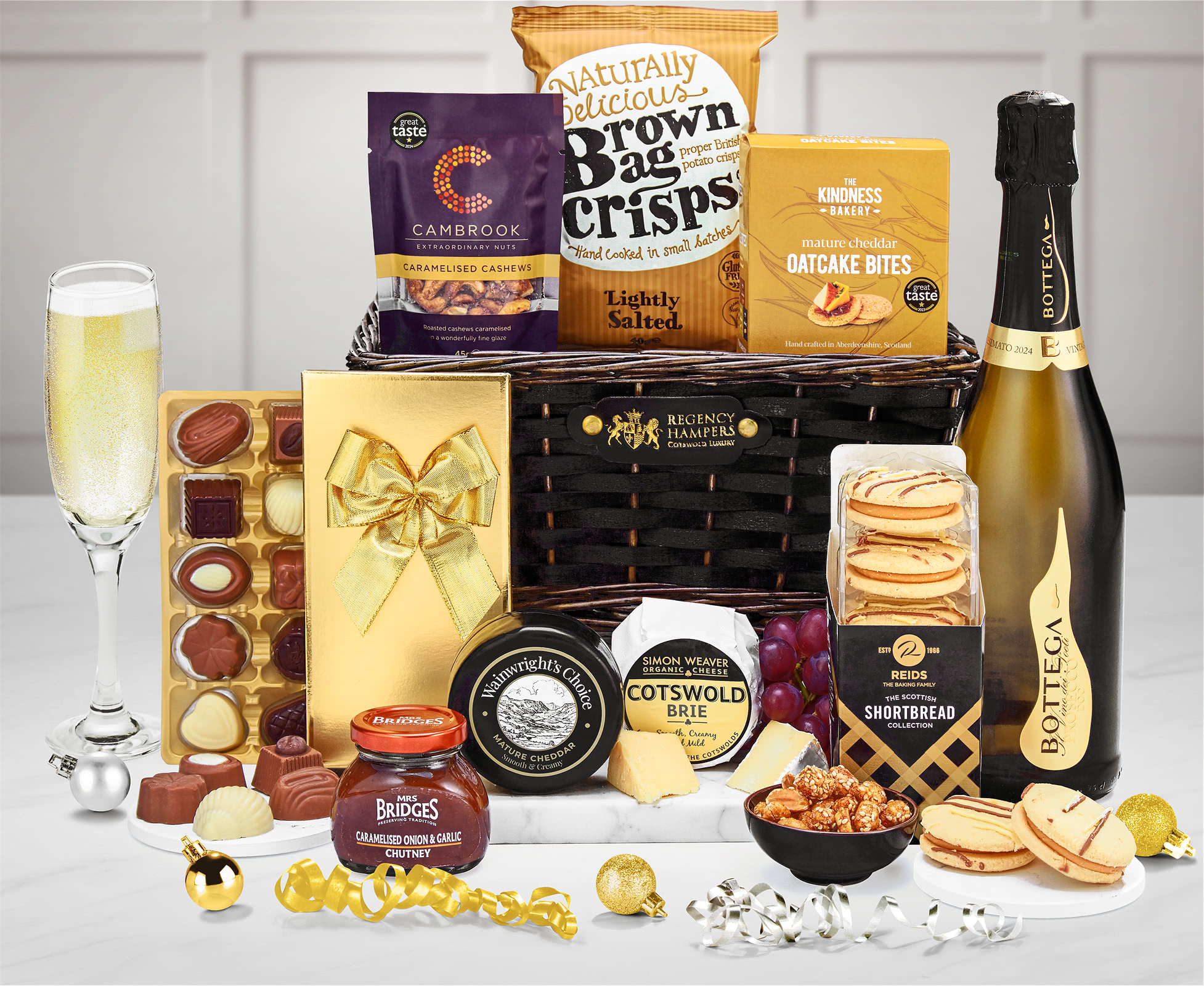 Artisanal Cheese & Accompaniments: Next, enjoy a selection of British cheeses – Wainwright's Choice Vintage Mature Cheddar Truckle and Simon Weaver Organic Cotswold Brie. To complement the festive cheeseboard, we've also included Mrs Bridges caramelised onion chutney and savory oatcakes.