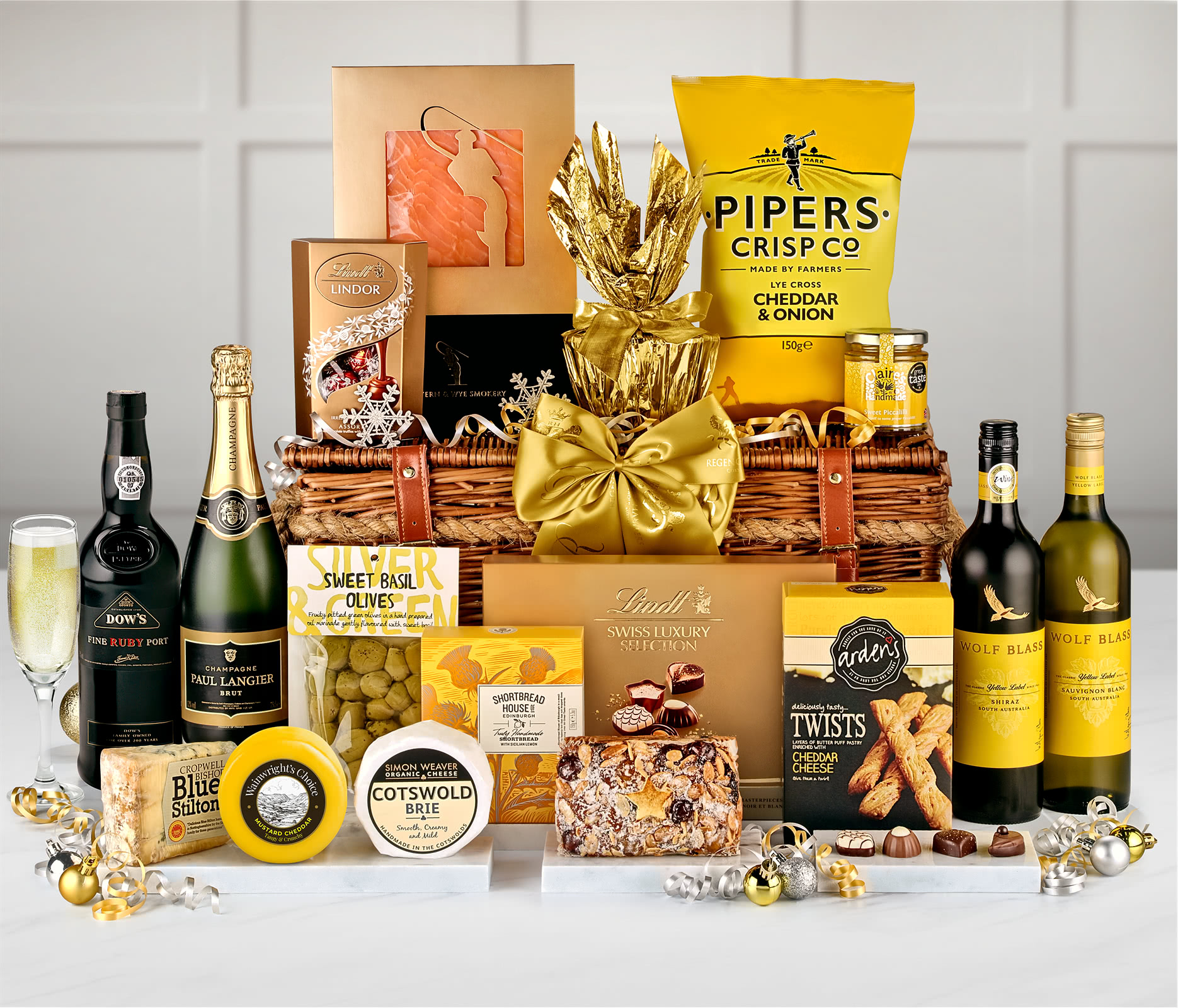 Premium Christmas Drink Selection: A hamper with both premium sparkling wine and fine reds, with Paul Langier Brut Champagne, a bottle of Wolf Blass Yellow Label wine, and Dow's Fine Ruby Port. Each vintage has been chosen to touch every aspect of the holiday season.