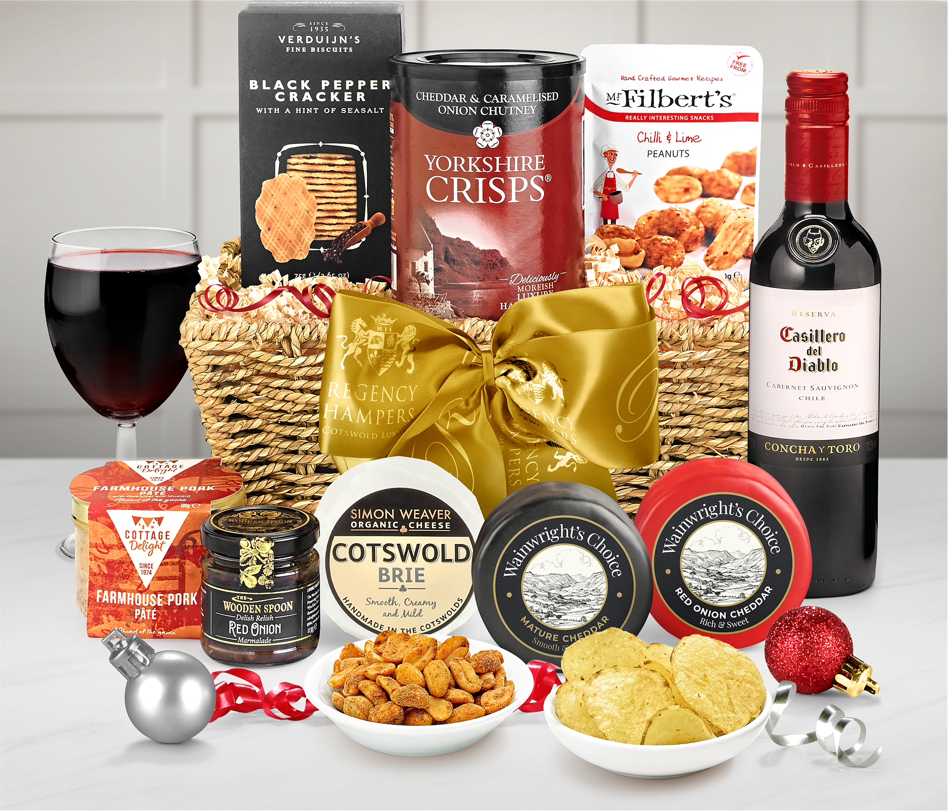 Premium Wine & Cheese Selection: Indulge in this sumptuous pairing featuring a smooth Casillero del Diablo Cabernet Sauvignon alongside three artisanal British cheeses. There is mature cheddar, a caramelised red-onion cheddar, and an organic Cotswold brie, all sitting beside a little farmhouse pâté and some red-onion chutney. The mix may sound fancy, but it feels homely.
