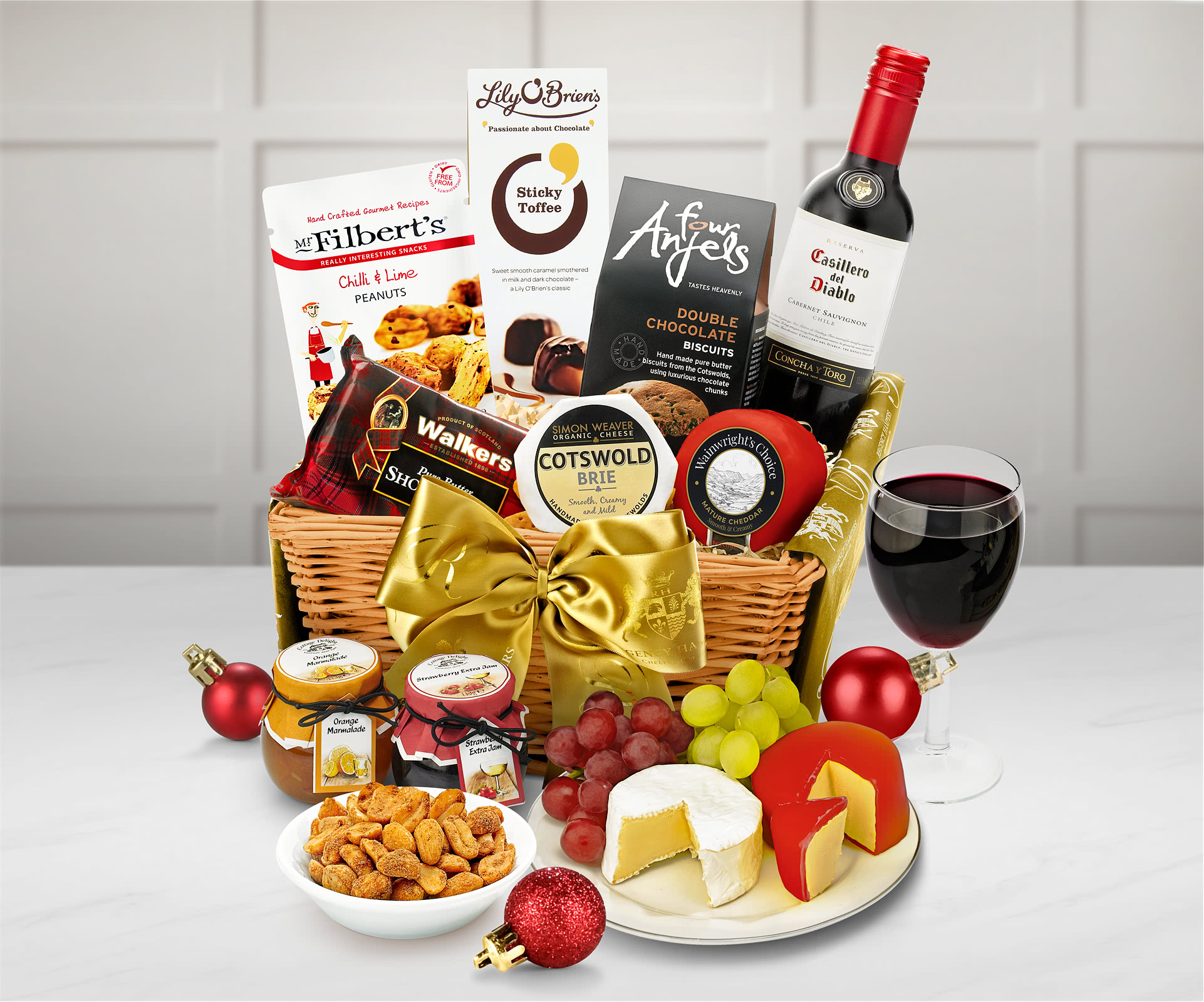 Premium Red Wine & Artisan Cheese Selection: This deluxe hamper showcases a smooth Casillero del Diablo Cabernet Sauvignon, perfectly paired with exceptional British cheeses. The vintage mature Cheddar truckle and organic Cotswold Brie offer a sophisticated tasting experience, complemented by chilli & lime peanuts for a contemporary twist.