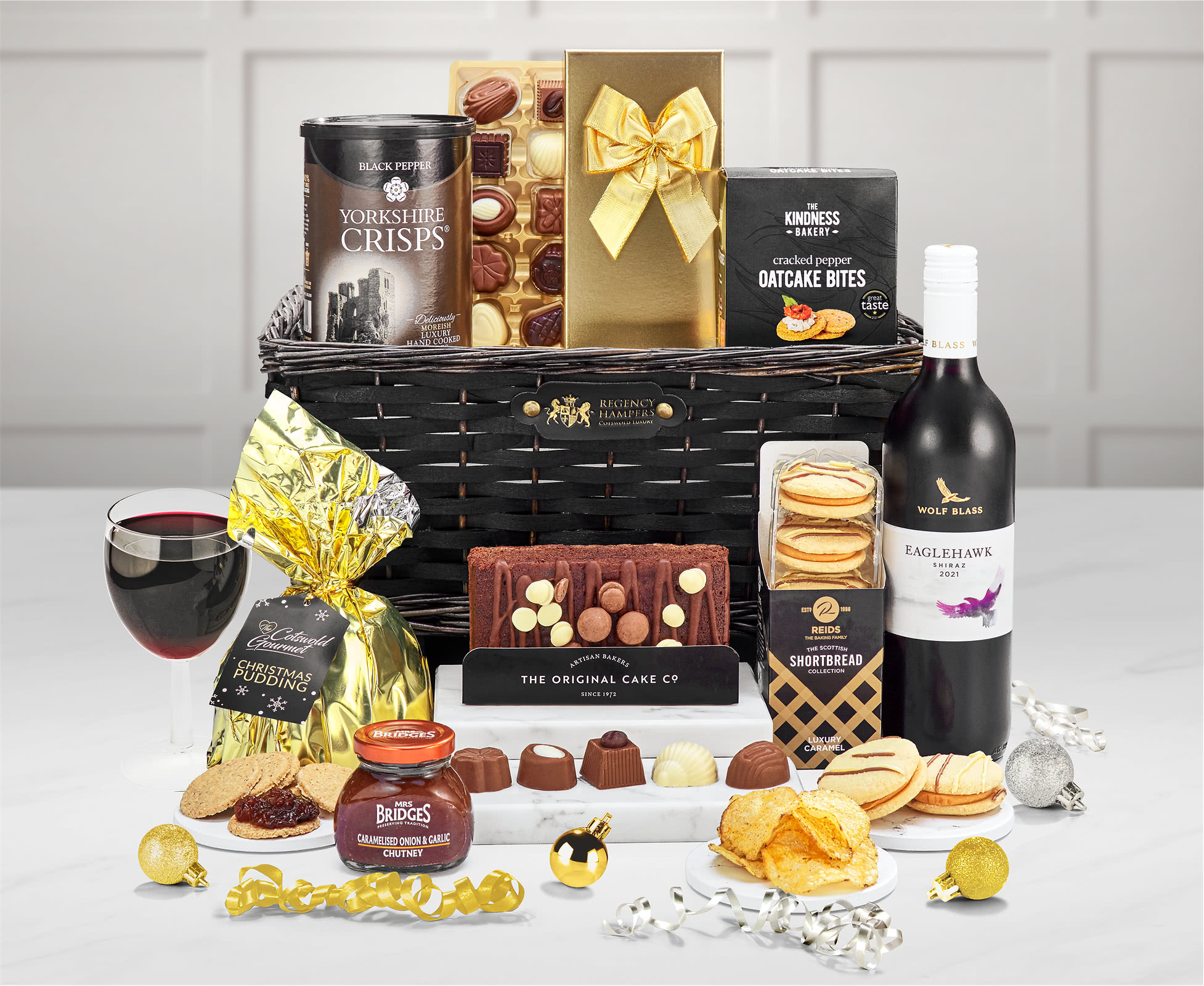 Traditional Christmas Delights: The other side offers classic holiday foods. A Cotswold Gourmet Christmas pudding sits with Hamlet Belgian chocolate pralines, Yorkshire black-pepper crisps, and a slab of chocolate truffle cake from The Original Cake Company.
