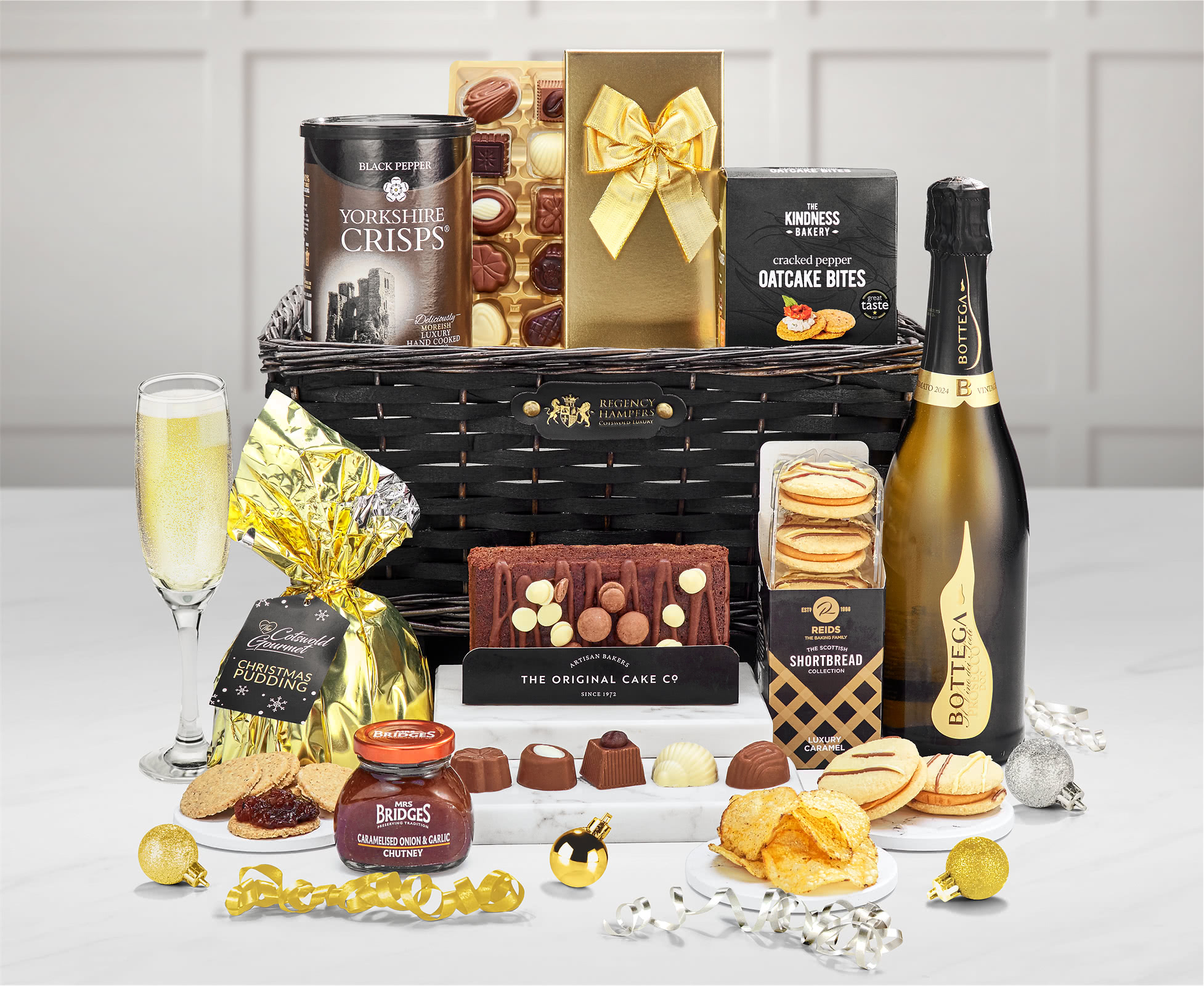 Get Merry with Bubbly: This hamper may include Bottega Millesimato Spumante Brut Prosecco, a crisp Italian sparkling wine. The 75cl bottle brings elegant bubbles that pair well with tasty Yorkshire black pepper crisps and home-made oatcake bites.