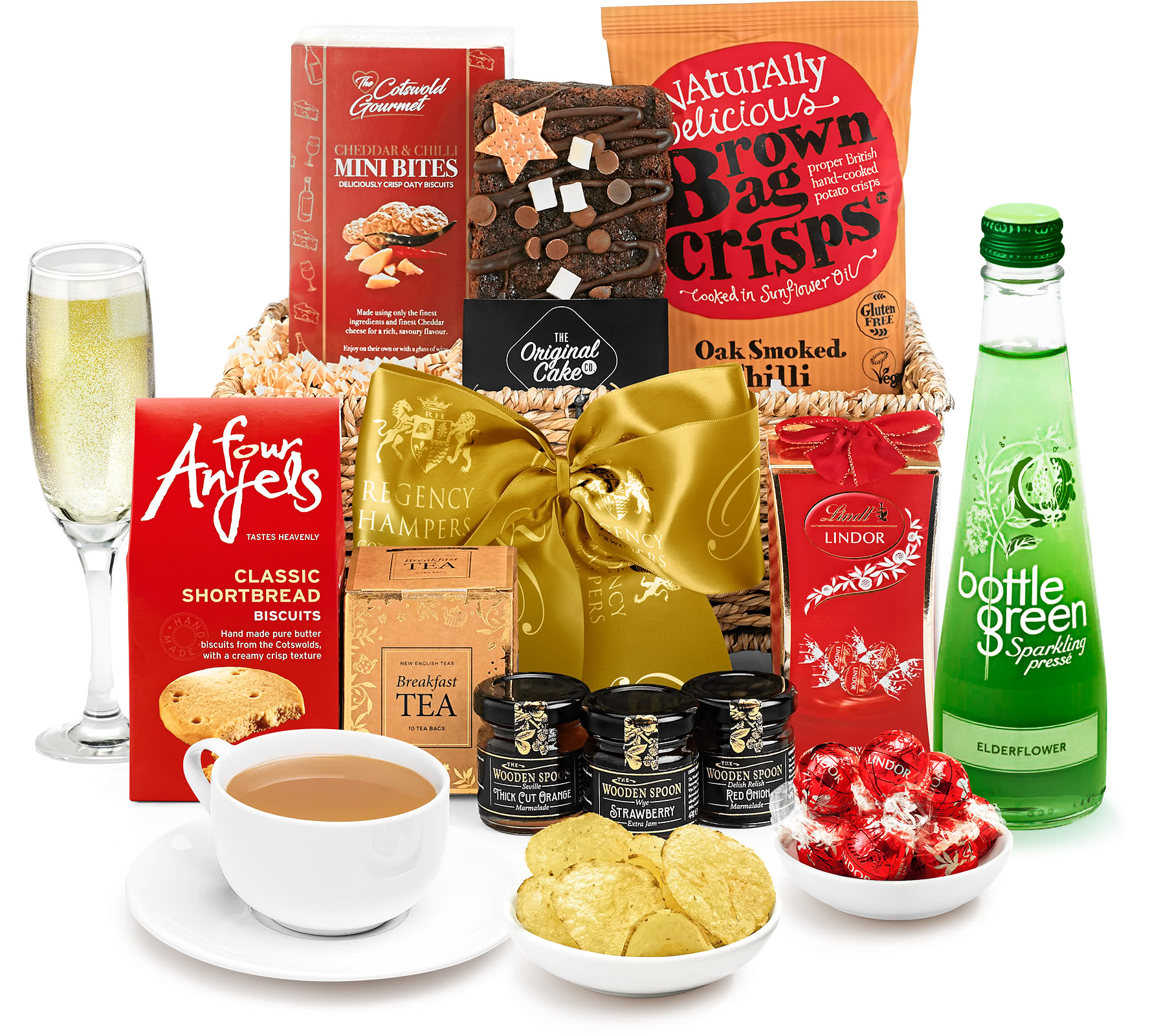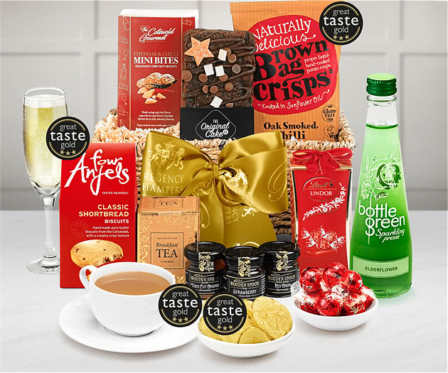 And that's not all. The hamper gift also includes The Cotswold Gourmet Cheddar Cheese & Chilli Mini Bites, perfect for snacking on, and Brown Bag Oak Smoked Chilli Crisps, which are the ideal accompaniment to a glass of pressé. If you're looking for something sweet, the Four Anjels Cotswold Luxury Shortbread and Original Cake Company Chocolate Tray Bake are sure to hit the spot. And last but not least, Lindt Milk Chocolate Lindor in Gift Box and New English Tea Breakfast Tea Bags round off this hamper gift perfectly.