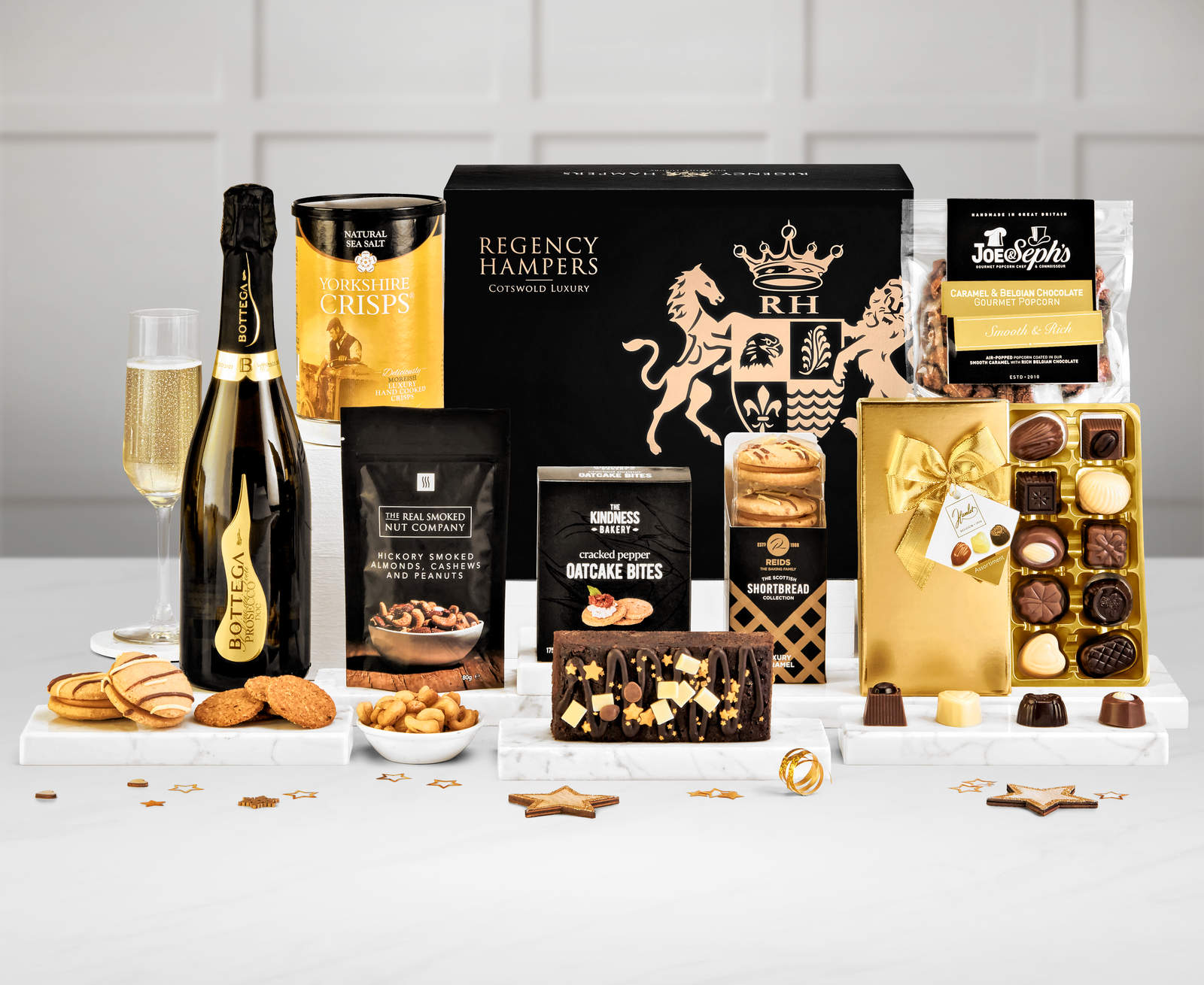 Exceptional Prosecco Selection: This hamper's centrepiece is Bottega Millesimato Spumante Brut Prosecco, a crisp and elegant bubbly that is perfect for celebrating. This fine vintage is complemented by some of our best savoury snacks, including hickory-smoked nuts, black pepper oatcakes, and good old-fashioned Yorkshire crisps.
