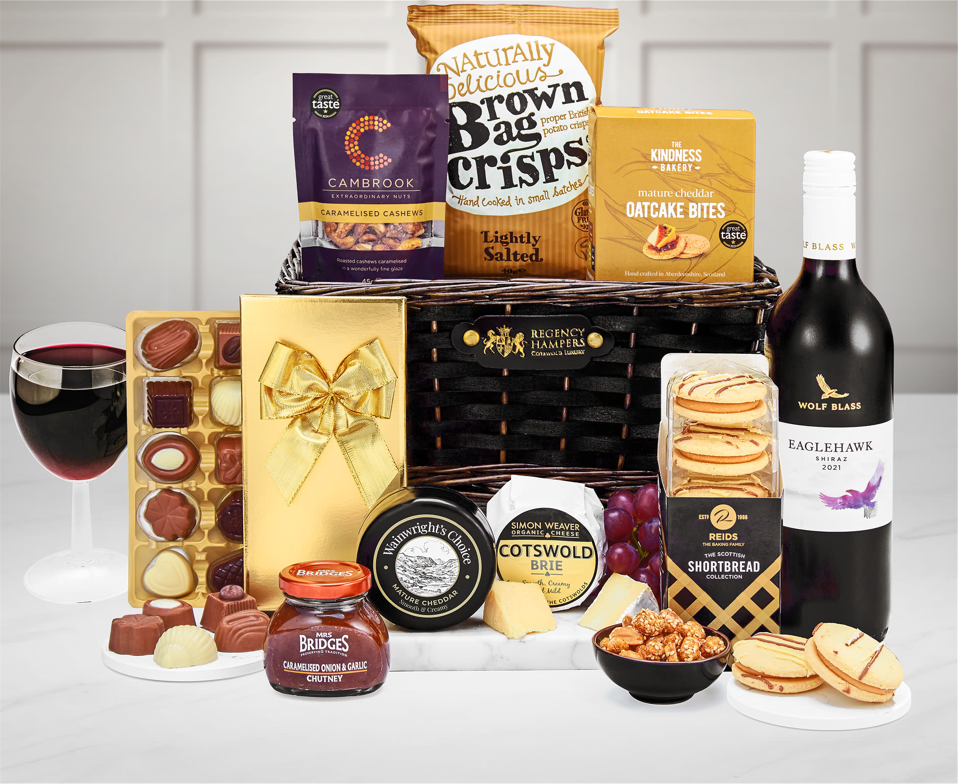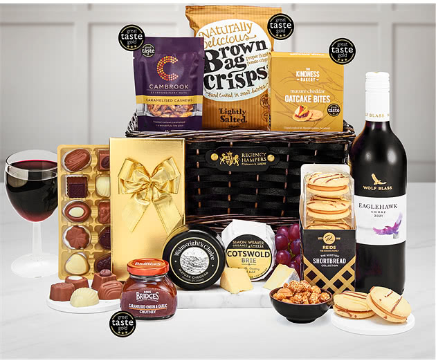 Premium Cheese & Wine Selection: This deluxe hamper is focused on Wolf Blass Eaglehawk Cabernet Sauvignon, a deep and luxurious wine from Australia that is bold enough to stand alongside the vintage cheeseboard that it shares the hamper with. The cheeseboard stars Wainwright's Choice Vintage Mature Cheddar and Simon Weaver Organic Cotswold Brie, alongside make-pairs like Mrs Bridges Caramelised Onion Chutney (a revealed gnosh for the cheeseboard) and The Kindness Bakery Cracked Black Pepper Oatcakes.