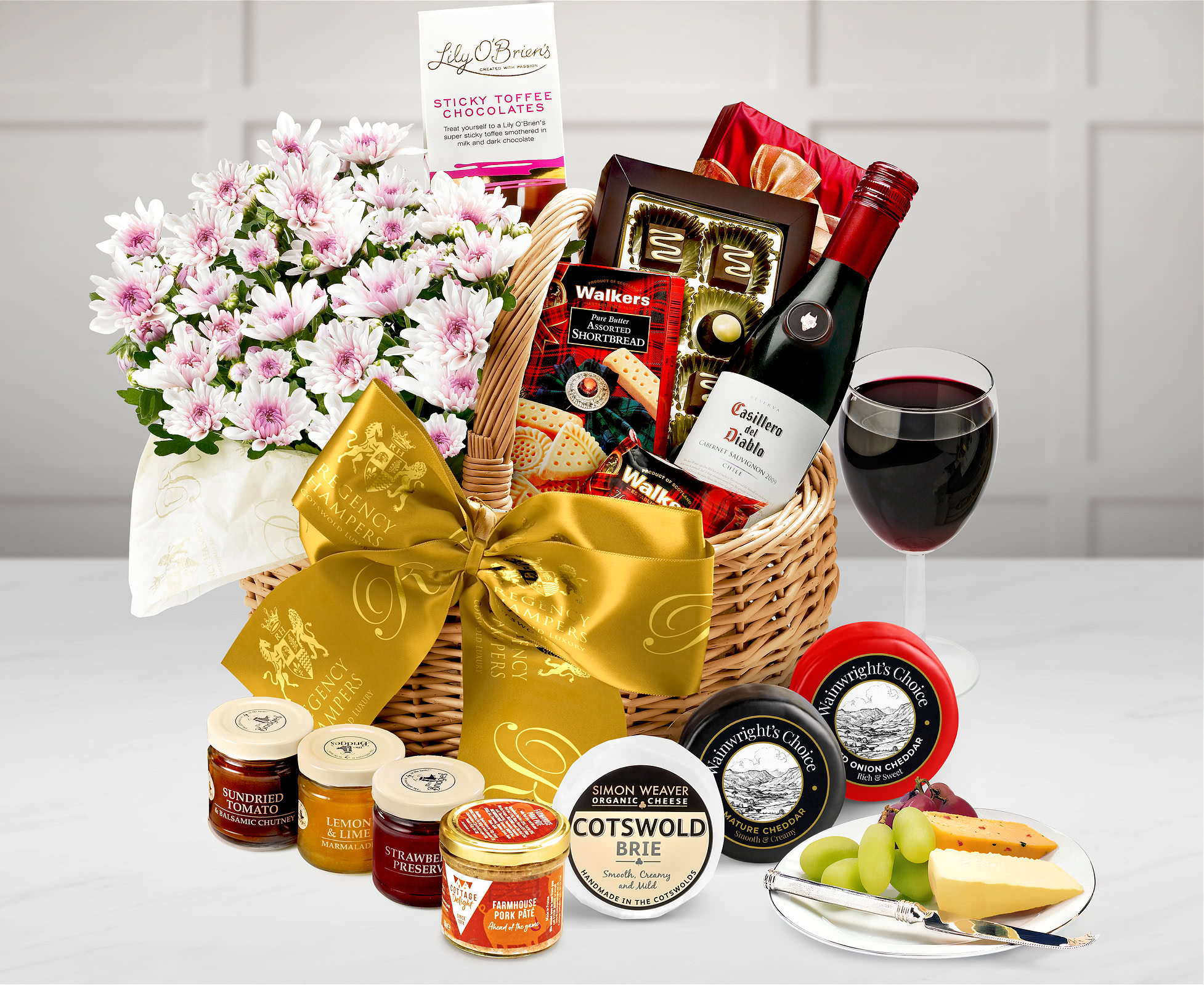 The Austen Floral Gift Hamper is flush with flowers and full flavours, dry cheddar, and the fruity notes of red wine.