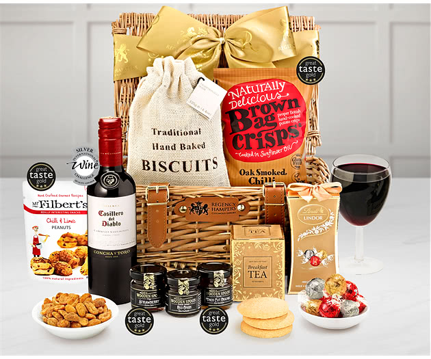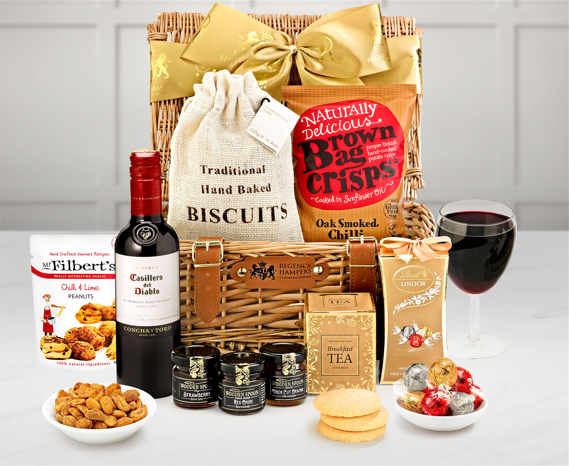 Looking for a gift that's sure to impress? The Chalcot Hamper with Red Wine is the perfect choice. This luxurious gift hamper from Regency Hampers is packed full of delightful treats and comes in a hand-made 12" lidded willow picnic basket with a locket clasp, making it an ideal present for any occasion. Whether it's for a birthday, anniversary, or just to say thank you, this hamper gift is sure to delight.