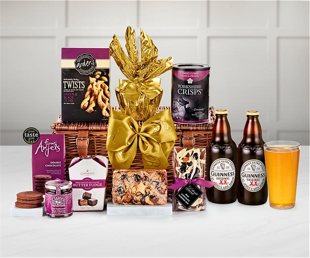 This attractive wicker picnic hamper basket contains two bottles of premium Guinness as well as a selection of food treats to add enjoyment to any special occasion. Particular delights in this Chalford picnic hamper basket include Arden's Green & Black Olive Twists, Sweet Cured Ham & Pickle Yorkshire Crisps and a jar of Claire's Handmade Old Fashioned Plum Chutney. Sweet treats feature Four Anjels Double Chocolate Biscuits as well as a delicious Fruit & Nut Slab Cake with Marzipan Star from The Cotswold Gourmet to which we add a classic Chocolate Pudding. This Guinness Chalford picnic hamper basket also contains confectionery in the form of a delicious Chocolate Bar from bespoke British chocolate-makers Stas and a tempting packet of Copperpot Milk Chocolate Coated Butter Fudge. Choose the date for delivery when you order your handcrafted Guinness Chalford picnic hamper basket decorated with a hand-tied ribbon plus your own personalised message.