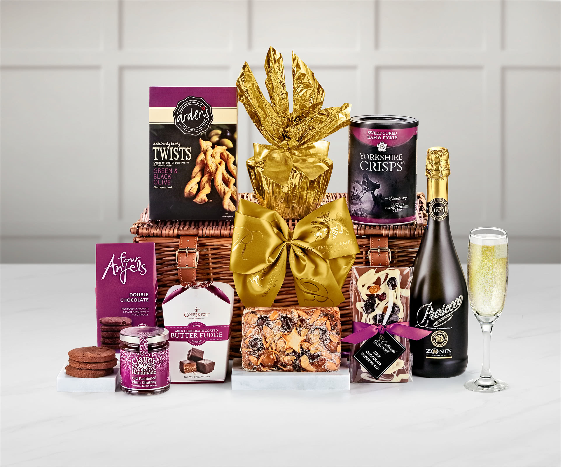 We pack a superb bottle of Zonin 1821 Prosecco Doc Spumante sparkling Italian white wine into this elegant wicker picnic basket together with so many more savoury and sweet delights. For example, we add Arden's Green & Black Olive Twists plus a packet of Sweet Cured Ham & Pickle Yorkshire Crisps and a delicious jar of Claire's Handmade Old Fashioned Plum Chutney. Sweet delights in this Gotherington wicker picnic basket include a Fruit & Nut Loaf Cake from The Cotswold Gourmet, Four Anjels Double Chocolate Biscuits and a classic Chocolate Pudding. To complete the sweet treats in the Gotherington Prosecco wicker picnic basket we feature a delicious Chocolate Bar and a packet of mouthwatering Copperpot Milk Chocolate Coated Butter Fudge. Select the delivery date when you place your order for this handcrafted Gotherington Prosecco Hamper in its wicker picnic basket with its hand-tied ribbon plus you can add your own personalised message.