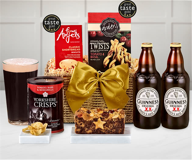 An ideal gift for anyone who enjoys drinking Guinness as this hamper contains two bottles of this superb Irish stout beer plus a range of savoury and sweet treats to help mark any celebration or special occasion. Our Clarendon Hamper with Guinness includes two bottles of this world-famous Irish stout accompanied by a selection of excellent food items presented in a stylish seagrass tray. Savoury snacks include Arden's Tomato & Basil Puff Pastry Twists plus a packet of Tomato, Basil and Mozzarella flavoured Yorkshire Crisps that go so well with the Guinness beer in this Clarendon Hamper. Sweet items include Cotswold Luxury Shortbread from Four Anjels and a rich Fruit & Nut Slab Cake adorned with marzipan star and sugar dusting from The Cotswold Gourmet. The gift hampers from Regency Hampers are beautifully packaged and presented. This Clarendon Hamper in its elegant seagrass tray arrives decorated with a golden hand-tied ribbon and you can also add your own personalised message. As this gift hamper contains alcohol it is not suitable for under 18s.