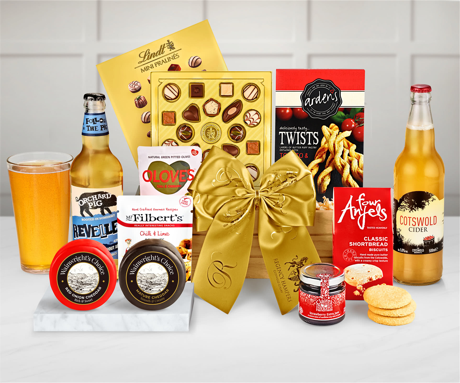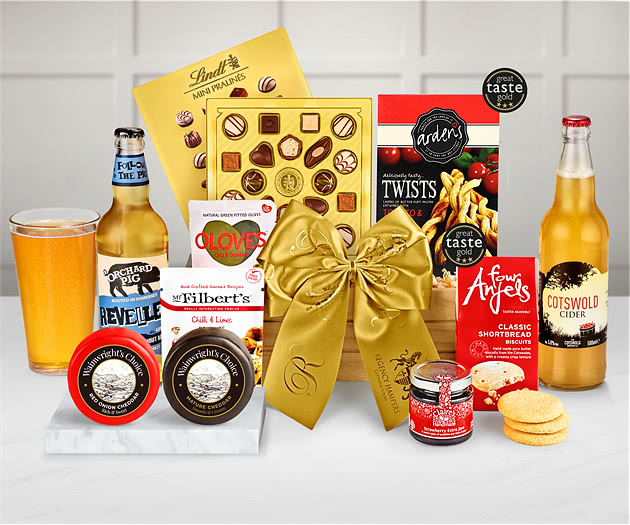 This stylish Coniston gift crate contains a host of treats and features two excellent bottles of traditional English cider. The Coniston Wooden Box with Cider contains one bottle of Cotswold Cider and one bottle of Orchard Pig ‘Truffler' Cider that go so well with the spicy peanuts and Chilli and Oregano Olives. This charming crate also contains two great British cheeses with Snowdonia Cheddar Truckle and Ilchester Wensleydale with Cranberries. These cheeses are matched with a jar of Claire's delicious Handmade Red Onion Marmalade. Sweet treats in this Coniston Wooden Box with Lager Beer crate include Four Anjels Cotswold Luxury Shortbread and a Classic Assortment of Thornton's Chocolates. You can arrange the date for delivery when you place your order for this handcrafted hamper while also adding a personalised message. As this gift hamper contains alcohol it is not suitable for under 18s.