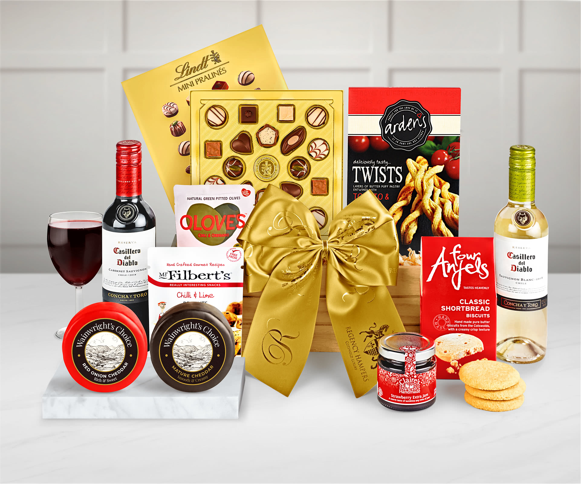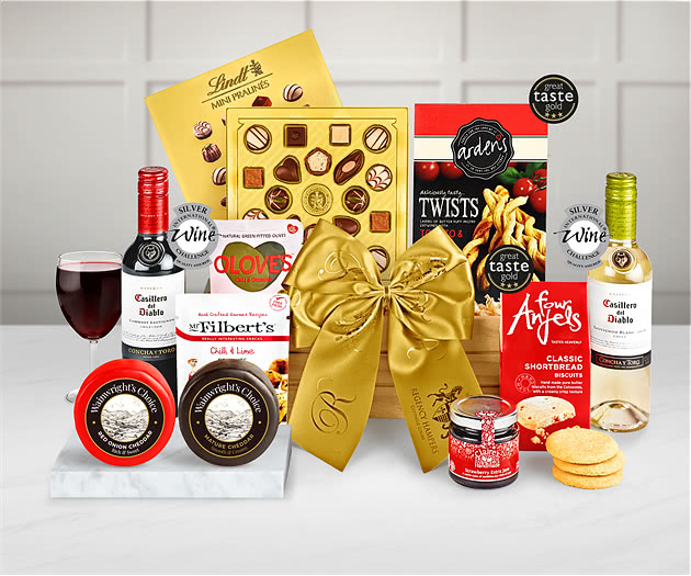 This elegant Coniston Wooden Box is packed with charming treats including two bottles of superb Chilean wine: one red and one white. Our Coniston gift crate contains a bottle of Casillero Del Diablo Cabernet Sauvignon red wine and a bottle of Casillero Del Diablo Sauvignon Blanc white wine together with Chilli and Oregano Olives and scrumptious spicy peanuts. This delightful gift box also contains two wonderful British cheeses: a Snowdonia Cheddar Truckle and an Ilchester Wensleydale with Cranberries. Sweet treats include Four Anjels Cotswold Luxury Shortbread Biscuits and Claire's Handmade Strawberry Jam. To complete this selection of delightful gifts we include a tempting box of Thornton's Classic Chocolates. . You can set the date for delivery when you place your order for this handcrafted hamper while also adding your own choice of personalised message. '.
