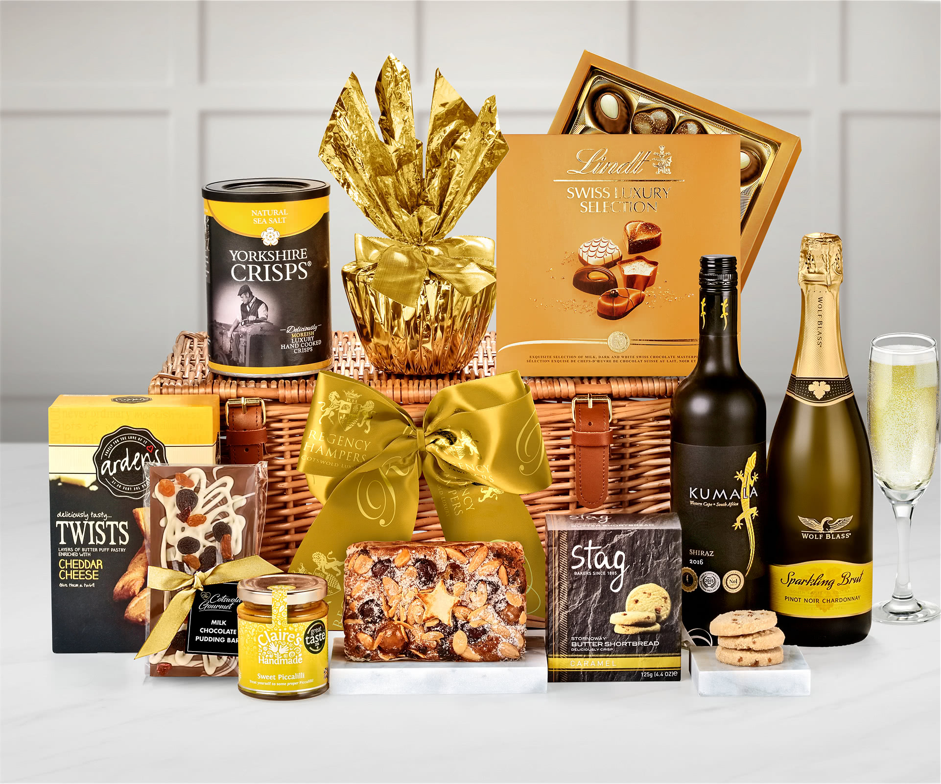 Inside this attractive food gift basket we carefully place a superb bottle of Wolf Blass Yellow Label Sparkling Brut Wine together with an excellent and full-bodied Shiraz red wine from the celebrated South African winemakers Kumala. Celebratory delights inside this Dorchester Hamper food gift basket include Arden?s Cheddar Cheese Twists, Natural Sea Salt Yorkshire Crisps and a jar of Claire's delicious Handmade Sweet Piccalilli. This food gift basket also contains sweet treats in the form of Stornoway Caramel Butter Shortbread plus a Fruit & Nut Loaf Cake with Marzipan Star from The Cotswold Gourmet and a traditional Chocolate Pudding. Chocolate lovers will be delighted by a delicious Chocolate Bar as well as a selection of Lindor Assorted Swiss Chocolate Truffles from master Swiss chocolatiers Lindt. You can choose the delivery date for your handcrafted Dorchester Hamper food gift basket with its hand-tied ribbon when you place your order when you can also add a personalised greetings message.