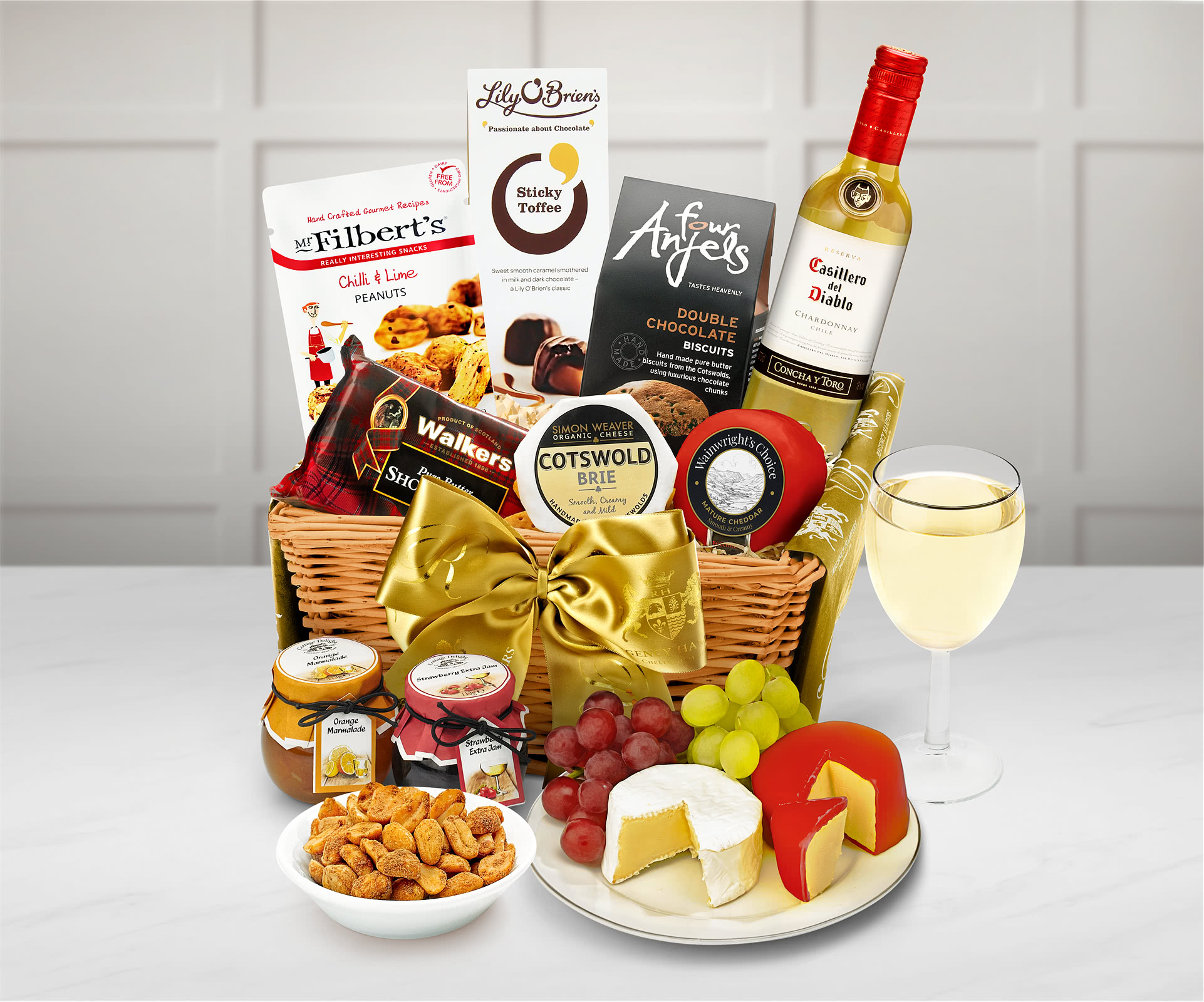 The Downton Hamper with White Wine presented in a stylish segrass tray offers a superb variety of gifts including an excellent bottle of Chilean white wine plus many more savoury and sweet treats. In addition to a delightful bottle of Casillero del Diablo Sauvignon Blanc wine, this Downton Hamper contains two award-winning British cheeses: Snowdonia Mature Cheddar Truckle and Simon Weaver's Organic Cotswold Brie. As savoury snacks we include ‘Perfectly Scrumptious' Spicy Peanuts from The Dormen and a pack of Walkers Highland Oatcakes together with such sweet delights as Four Anjels Double Chocolate Biscuits and Walkers Pure Butter Shortbread Fingers. You'll also find jars of Cottage Delight's Strawberry Extra Jam and classic Orange Marmalade alongside a tempting packet of Lily O'Brien's delicious Sticky Toffee Chocolates. The Downton Hamper with White Wine arrives tied with a beautiful golden ribbon and you can add your own greetings message when you order this popular present. As this gift hamper contains alcohol it is not suitable for under 18s.