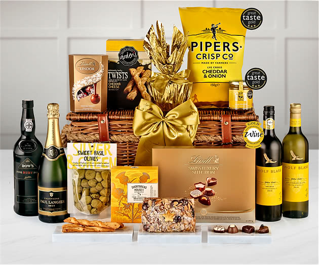 Indulge in the exquisite Grosvenor Hamper With Champagne, a luxurious gift that epitomises thoughtful giving. This hand-made lidded willow picnic basket, adorned with a rustic-style rope handle, is brimming with an array of delectable treats that are sure to delight. As you open this magnificent hamper, you'll discover a treasure trove of fine foods and beverages. We've carefully selected Paul Langier Brut Champagne to add a touch of sparkle to any occasion, alongside the robust Dow's Fine Ruby Port. For wine enthusiasts, we've included two exceptional Australian wines from Wolf Blass: the Yellow Label Shiraz and the crisp Yellow Label Sauvignon Blanc. The Grosvenor Hamper With Champagne doesn't stop at libations. You'll find an assortment of savoury delights, including Claire's Handmade Sweet Piccalilli and Silver & Green Sweet Basil Olives. For those with a sweet tooth, we've included Shortbread House Sicilian Lemon Shortbread Minis and a luxurious Jewel Topped Fruit Cake from The Original Cake Company. No hamper would be complete without chocolate, and this thoughtful gift delivers with Lindt Lindor Assorted Swiss Chocolate Truffles and a Lindt Swiss Luxury Chocolate Selection. These premium confections are the perfect accompaniment to a leisurely picnic or a cosy night in. Whether you're celebrating a special occasion or simply showing appreciation, the Grosvenor Hamper With Champagne is an ideal choice. Its contents are nestled safely within a protective cardboard outer, ensuring they arrive in pristine condition. If you can't decide what the perfect hamper is for the recipients, you could also consider our gift voucher, so the lucky recipient can pick their favourite gift themselves. With the Grosvenor Hamper With Champagne, we've crafted a truly memorable gift that embodies luxury and prestige.