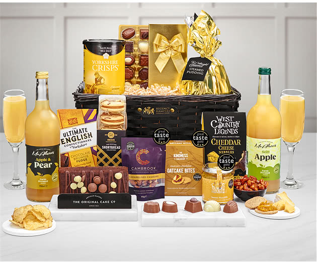 Artisan Food Selection: Indulge in carefully curated gourmet treats from Yorkshire Crisps Natural Sea Salt and Claire's Handmade Sweet Piccalilli to Lily O'Brien's Creamy Irish Caramels with Sea Salt. The hamper includes decadent desserts like The Original Cake Company's Chocolate Truffle Slab Cake and Cotswold Gourmet Steamed Lemon Pudding.