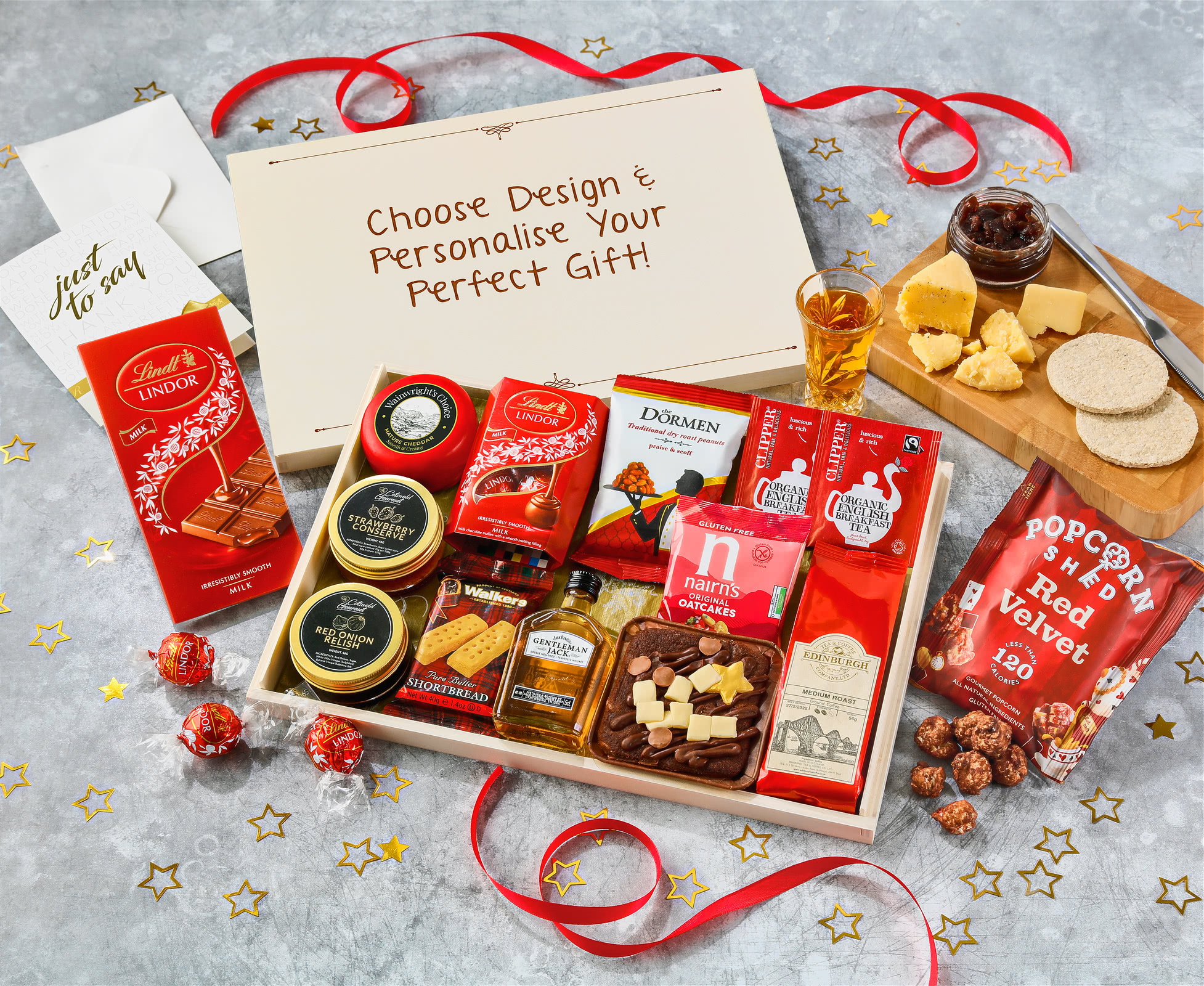 Artisan Food Collection: Uncover Wainwright's Selected Red Waxed Farmhouse Cheddar, Cotswold Red Onion Relish, and Nairn's Vegan Oatcakes next to decadent confections such as Lindt Lindor chocolates, Walkers shortbread, and the Red Velvet gourmet popcorn from Popcorn Shed. The combination is perfectly balanced between savoury and sweet.