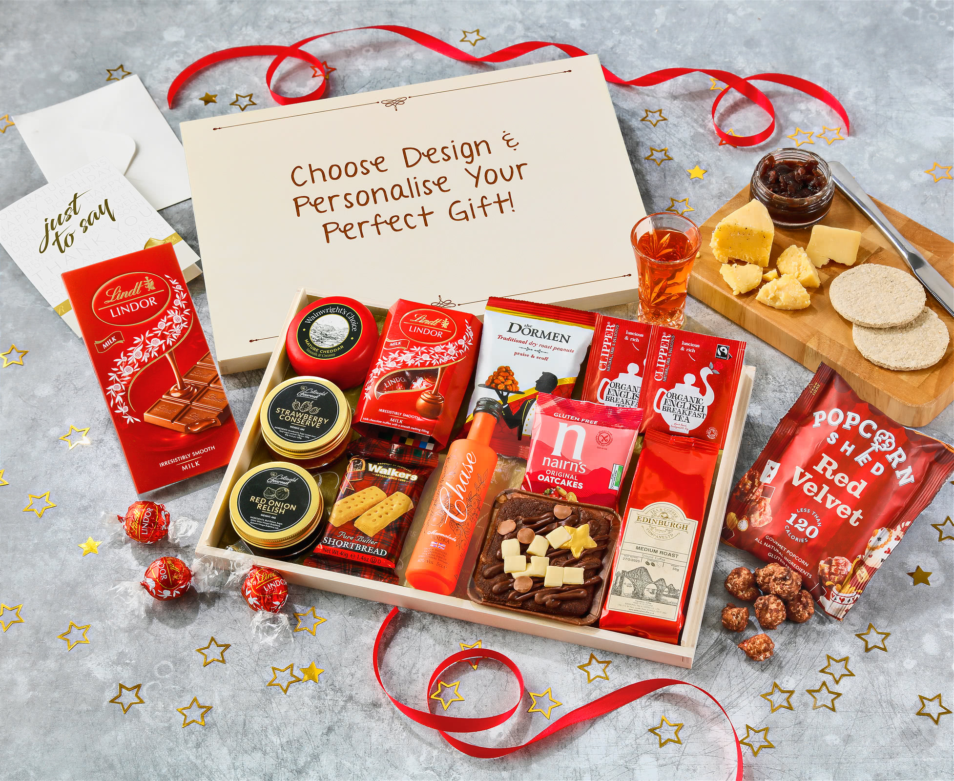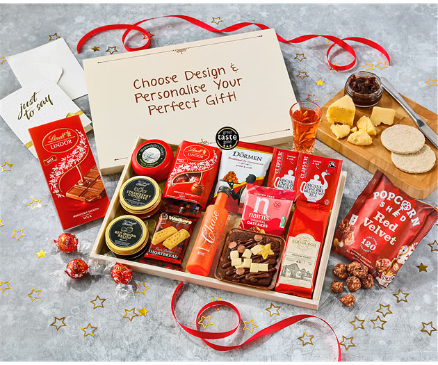 Artisanal Food Selection: Featuring sumptuous treats including Wainwright's waxed farmhouse cheddar, Cotswold red onion relish, and artisanal offerings from Lindt chocolates to traditional shortbread fingers. The carefully curated selection spans savoury delights like dry roast peanuts and vegan oatcakes to sweet indulgences including mini chocolate cake and gourmet red velvet popcorn.