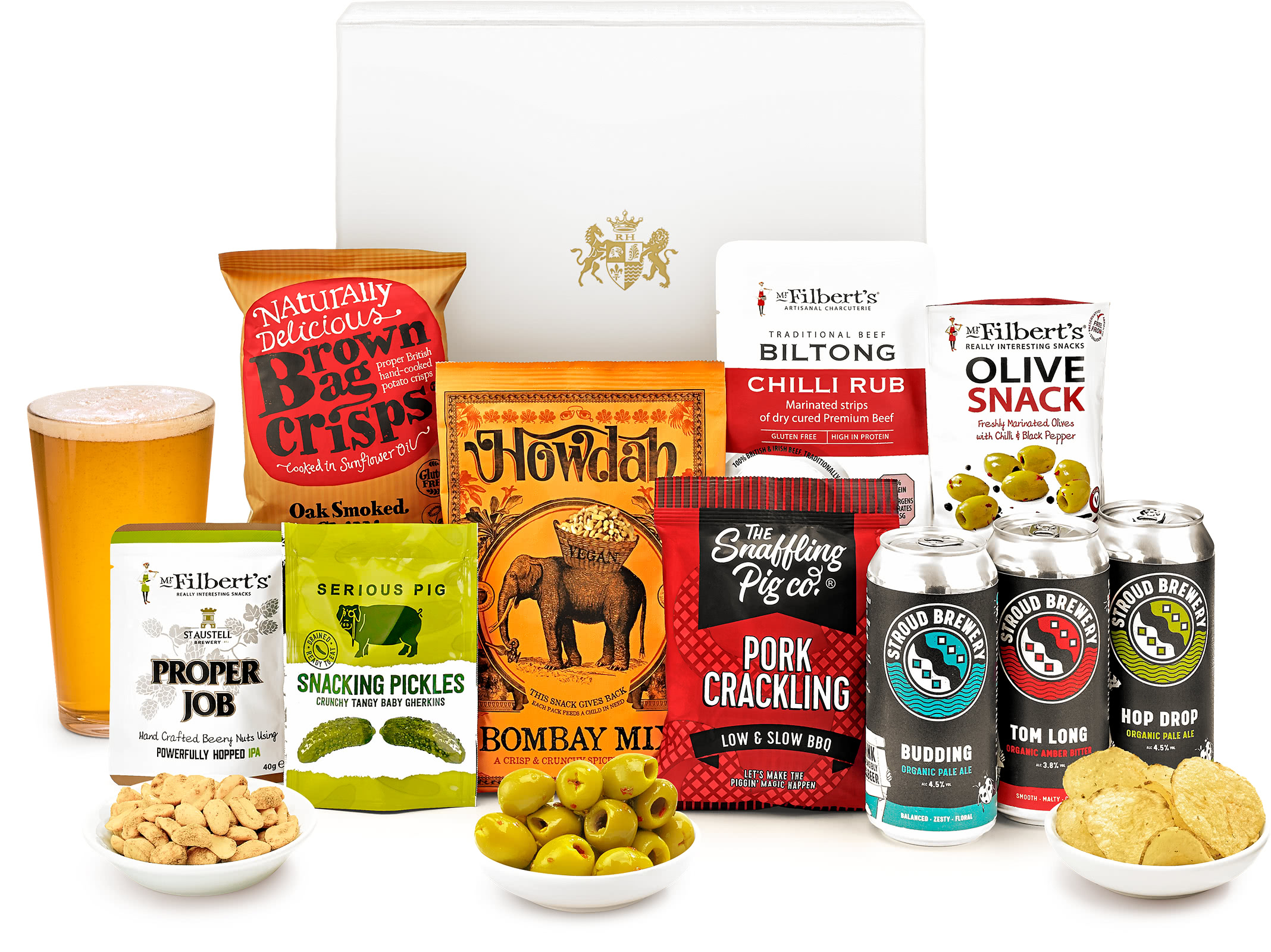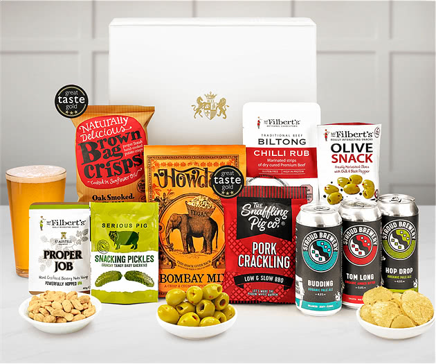 To complement the craft beers, this hamper gift also includes a range of delicious snacks that will satisfy any appetite. From spicy to smoky, from crunchy to chewy, there's something for everyone in this snack hamper. Try the pitted marinated olives with chilli and black pepper, the biltong chilli rub premium beef strips, the low and slow BBQ pork crackling, the beery peanuts, the Bombay mix spiced medley, the oak smoked chilli crisps, and the snacking pickles. All these snacks are made with natural ingredients and no artificial flavours or preservatives.