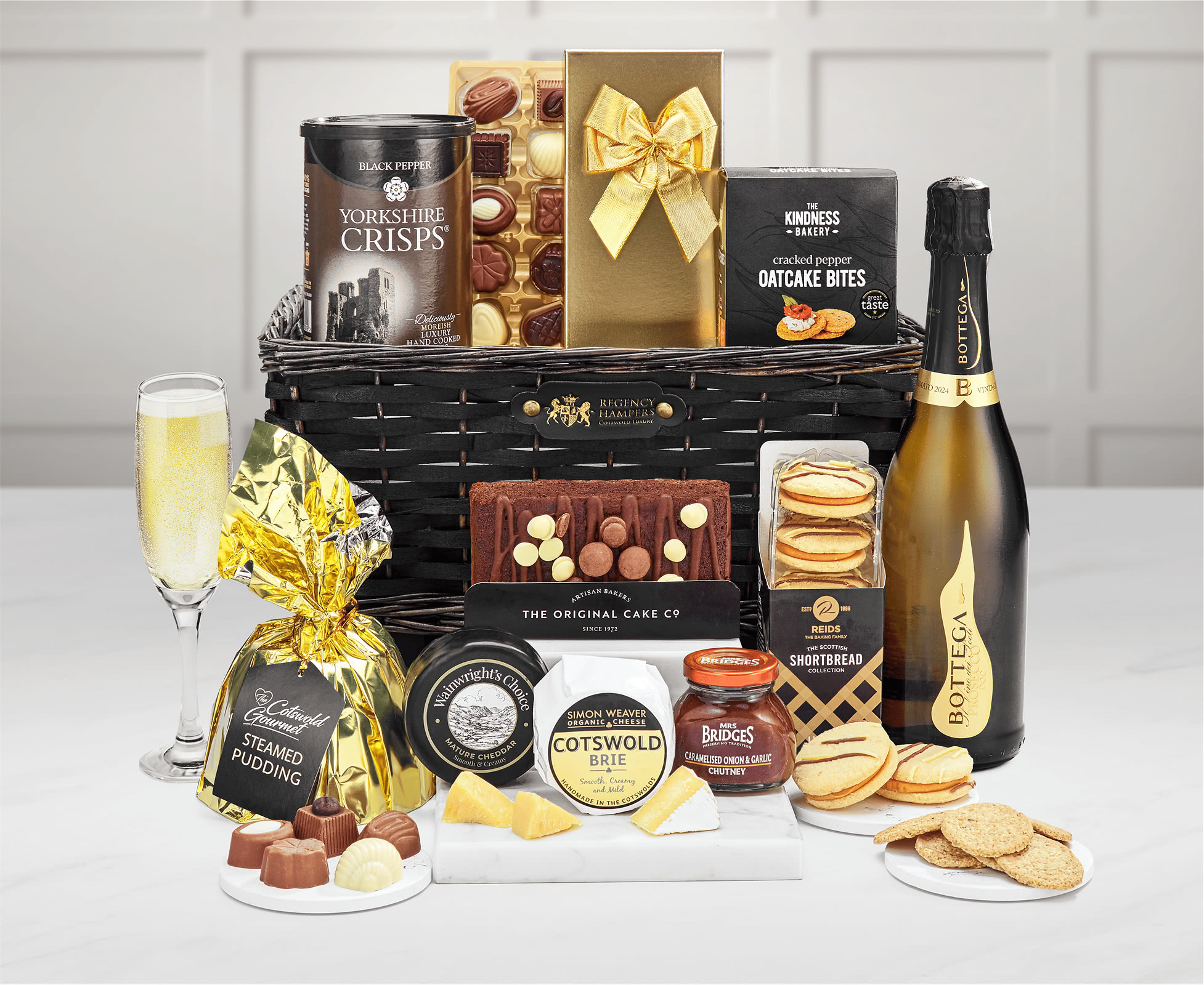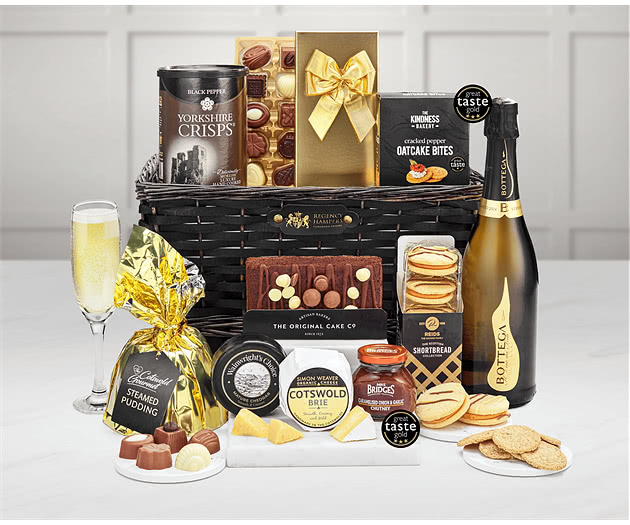 Celebration-Ready Selection: This deluxe hamper revolves around the premium Bottega Millesimato Spumante Brut Prosecco. Artisan cheeses, such as Wainwright's Choice Vintage Mature Cheddar and Simon Weaver Organic Cotswold Brie, perfectly complement the bubbly. And the sparkling wine is served with crisps from Yorkshire and Mrs. Bridges Caramelised Onion Chutney—both sharp and sweet—that make up an almost too-good-to-be-true taste of Yorkshire.