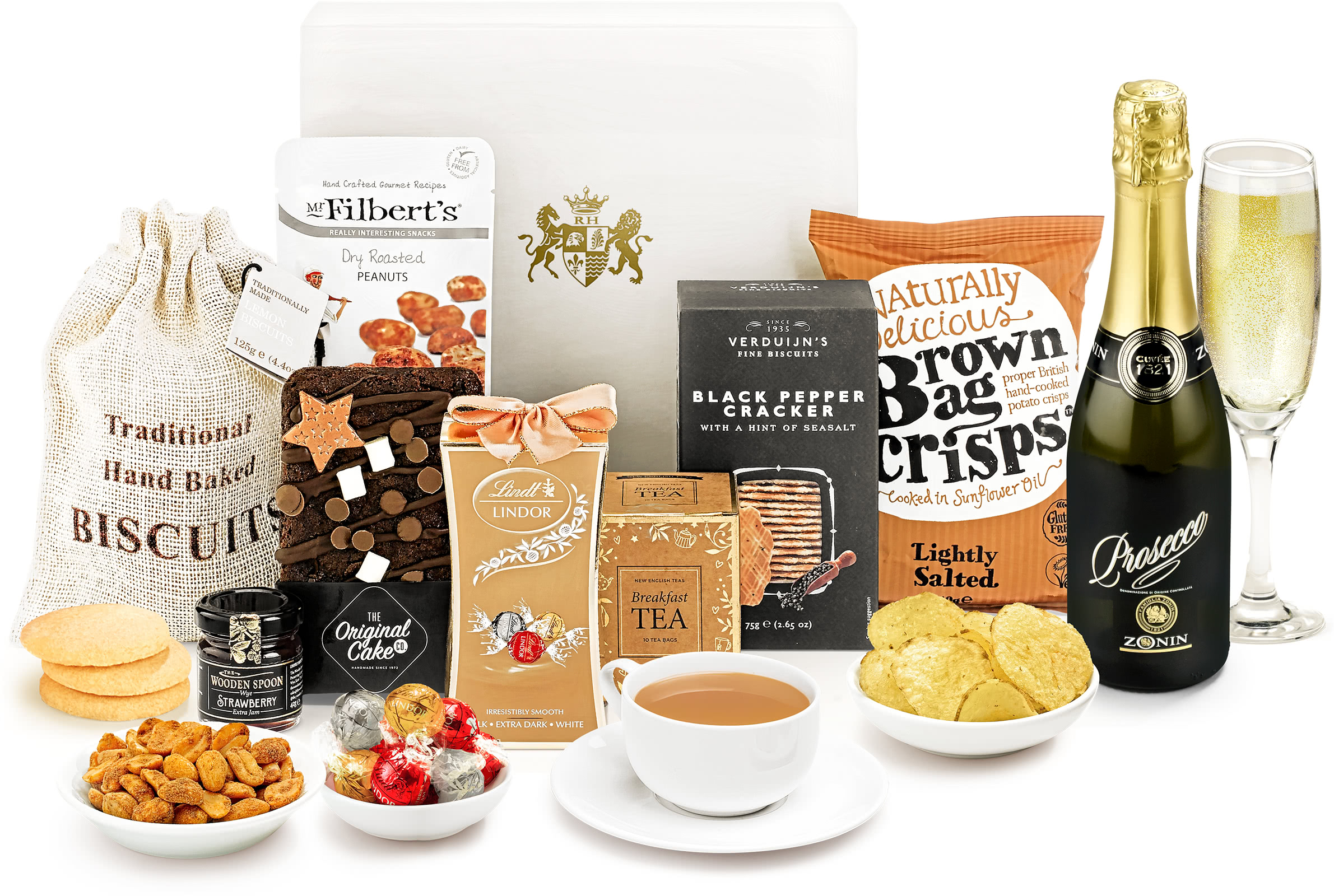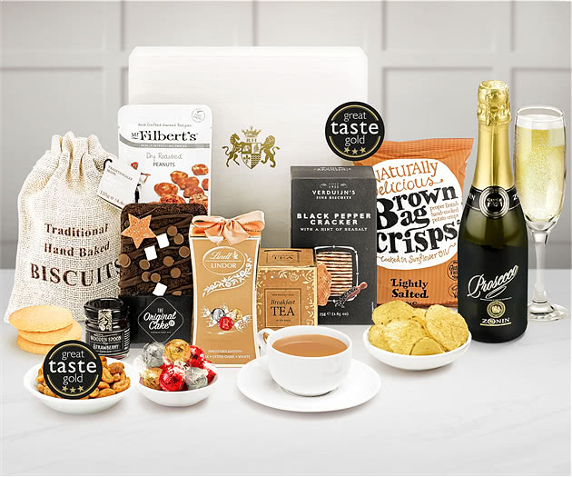 The Lindt milk chocolate Lindor in gift box, lightly salted crisps, and breakfast tea are the perfect accompaniments to the sparkling wine, creating a gift that's both sumptuous and sophisticated.