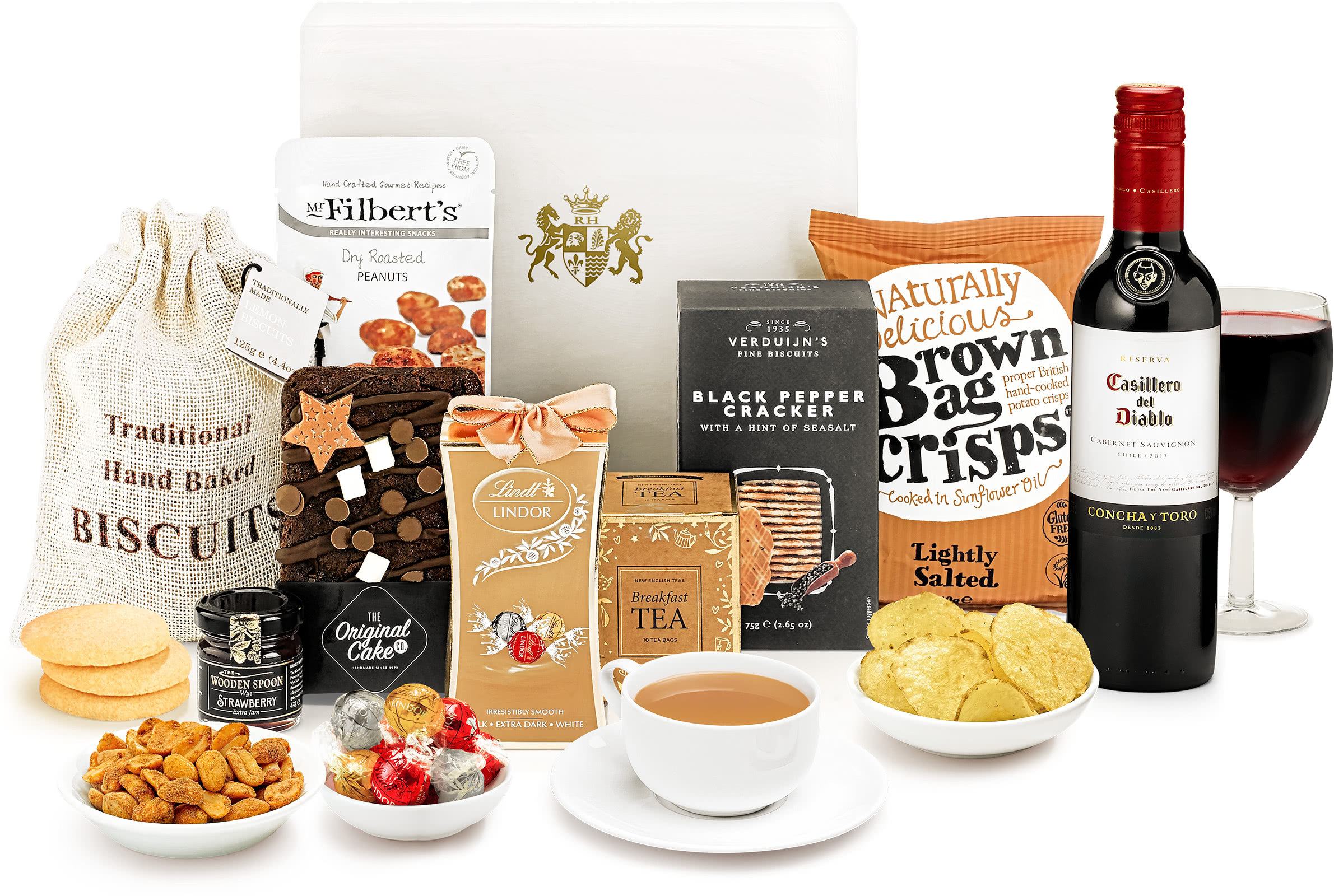 Treat your loved ones to a gourmet experience with the Penrith Hamper with Red Wine, available for UK delivery on your preferred date. This gift hamper is packed with luxurious treats, including a bottle of red wine, a variety of savoury snacks, and sweet delights, all beautifully presented in a Regency-branded decorative postal outer.
