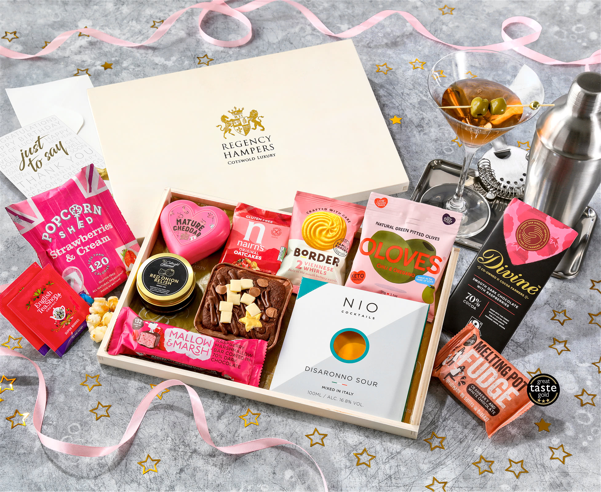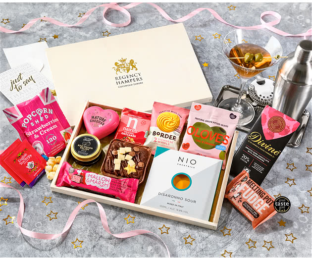 Luxurious Letterbox Indulgence: This luxury hamper comes beautifully packaged in a deep letterbox with a custom lid that showcases the star of the show—a pre-mixed Disaronno Sour cocktail from NIO Cocktails. The cocktail is paired with Wainwright's Choice, a red-waxed farmhouse cheddar in a charming heart-shaped truckle. Together, they make for a perfect evening treat combination.