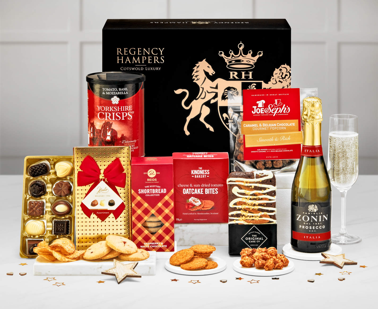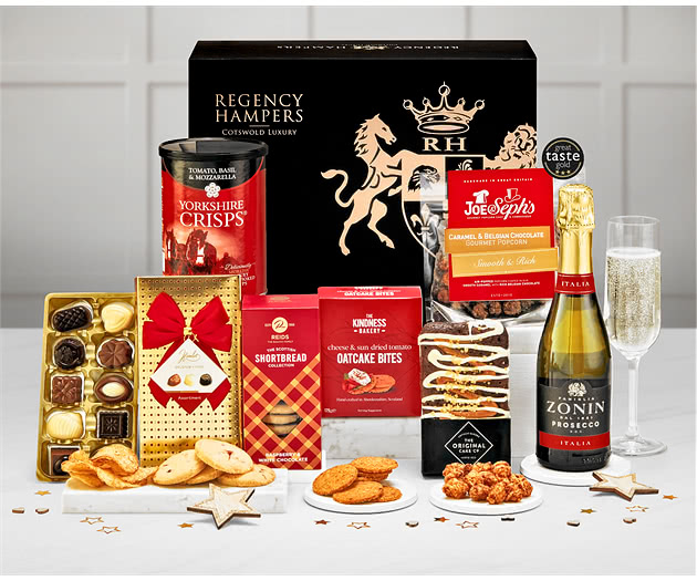 Sparkling Celebration: This delightful hamper centres around a bottle of Zonin Prosecco DOC, perfectly complemented by an array of gourmet treats. The sparkling Italian wine, full of effervescence, combines brilliantly with both the sweet and savoury selections in this collection.