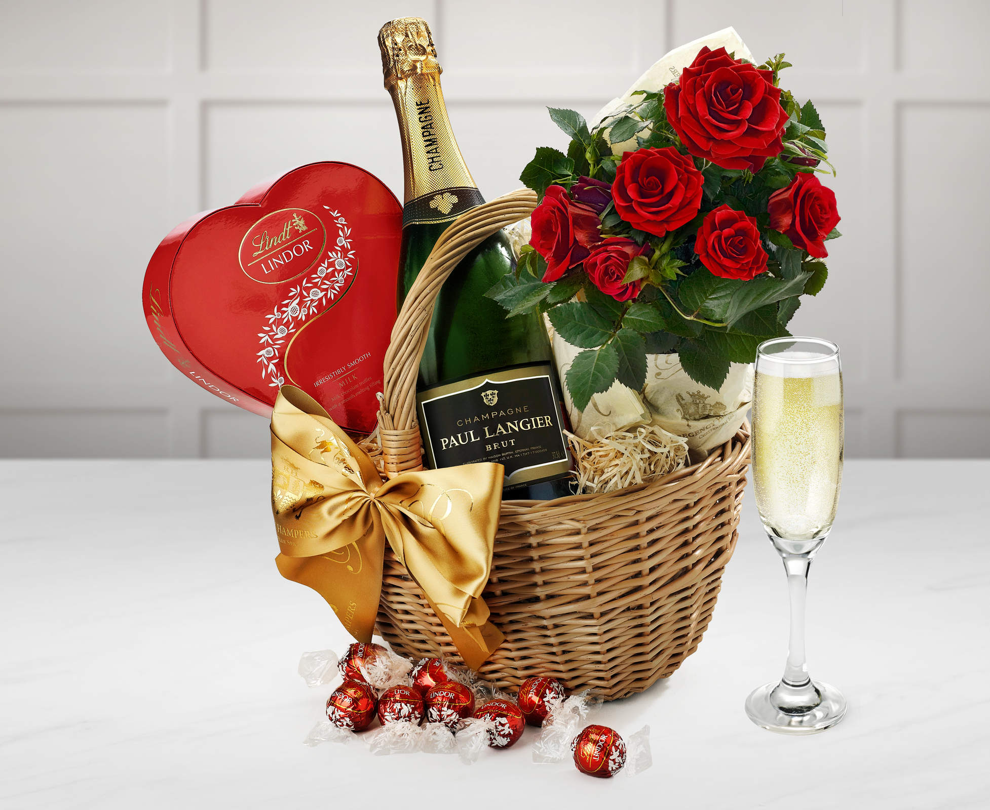 This floral gift hamper also contains a full bottle of Paul Langier brut champagne: a lavish centrepiece worthy of the most discerning tastes. After the special occasion, the mini rose plant can be planted outside in the garden where it will hopefully flourish and bloom as it grows.