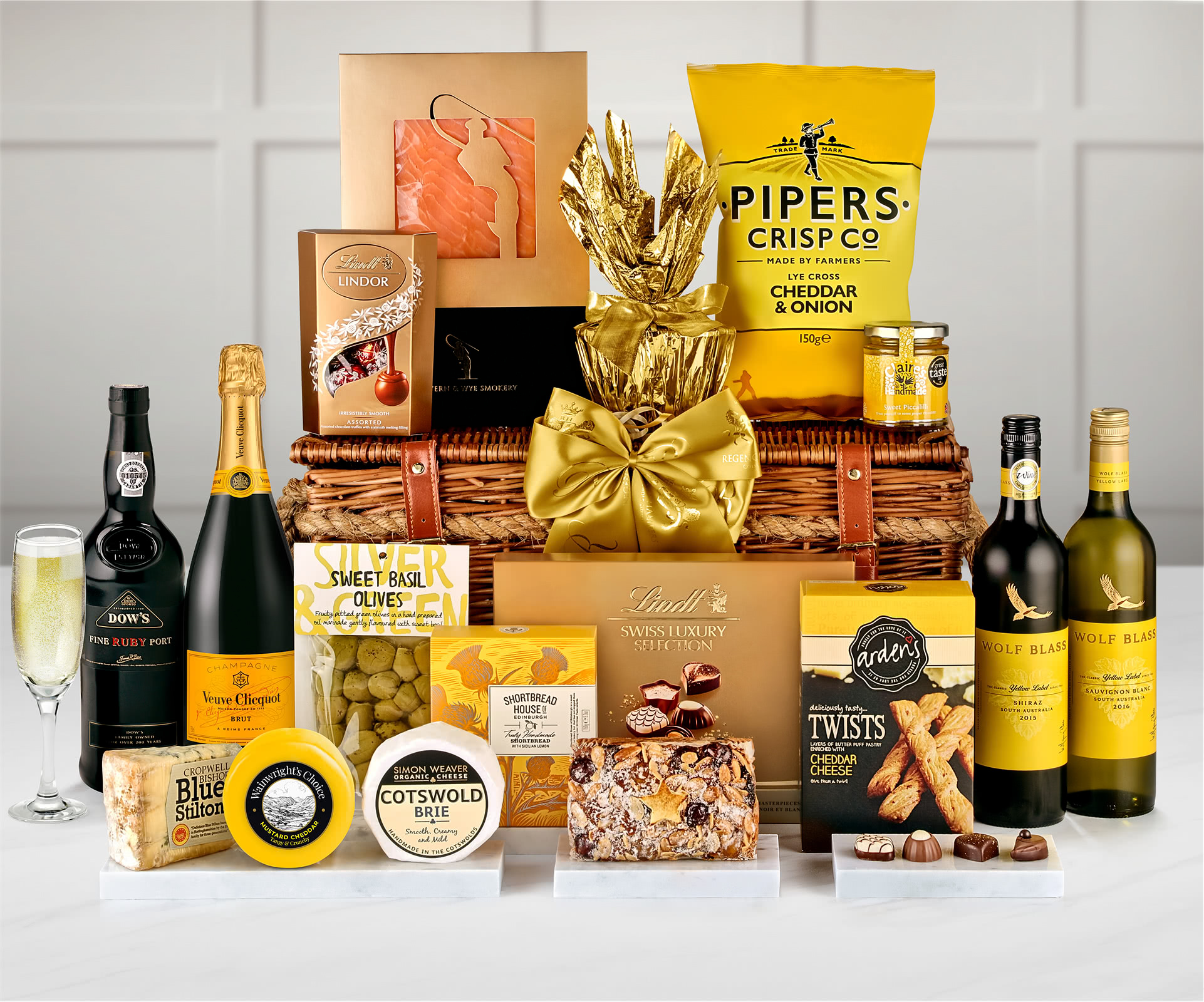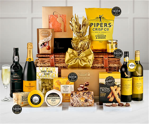 This Sandringham gourmet gift hamper is a large willow basket full of delicious food and drink treats including Paul Langier Brut Champagne, Dow?s Fine Ruby Port and two superb Australian wines: Wolf Blass Yellow Label Shiraz red wine and Yellow Label Sauvignon Blanc white wine. Within this large gourmet gift hamper we also include Premium Severn & Wye Smoked Salmon plus three award-winning British cheeses with Select Extra Mature Cheddar from Snowdonia, Organic Cotswold Brie from Simon Weaver and a delicious Cropwell Bishop Blue Stilton. The Sandringham gourmet gift hamper also features savoury snacks such as Sweet Basil Olives, Claire?s Handmade Sweet Piccalilli, Arden?s Cheddar Cheese Twists and Pipers Lyecross Cheddar & Onion Crisps. Sweet treats include Sicilian Lemon Shortbread, Fruit & Nut Loaf Cake with Marzipan Star from the Cotswold Gourmet and a classic Chocolate Pudding. Confectionery within this large gourmet gift hamper includes Lindor Assorted Swiss Chocolate Truffles and a Luxury Chocolate Selection from the Swiss chocolatiers Lindt. Choose the most suitable date for delivery when you order this handcrafted Sandringham gourmet gift hamper with its golden hand-tied ribbon and personalised message.