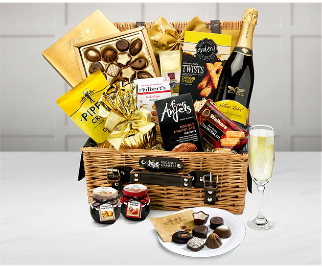 The Tetbury Sparkling Wine Hamper contains a sophisticated Sparkling Brut Pinot Noir Chardonnay from the Wolf Blass Yellow Label range that adds sparkle to any celebration. Inside this attractive willow picnic hamper you'll also find Mondovino Porcini Mushroom together with Cottage Delight's Caramelised Onion Chutney. Further savoury items include Pipers Lyecross Cheddar & Onion Crisps and a pack of 'Perfectly Scrumptious' Spicy Peanuts from The Dormen. For sweet treats the Tetbury Sparkling Wine Hamper contains Cole's Chocolate Pudding, Walkers' Pure Butter Shortbread Fingers, Four Anjels delicious Double Chocolate Biscuits and a jar of Strawberry Extra Jam from Cottage Delight. To round off a fine meal there is Edinburgh After Dinner Coffee while to indulge a love of chocolate we include a Luxurious Swiss Chocolate Selection from Lindt. As this gift hamper contains alcohol it is not suitable for under 18s.