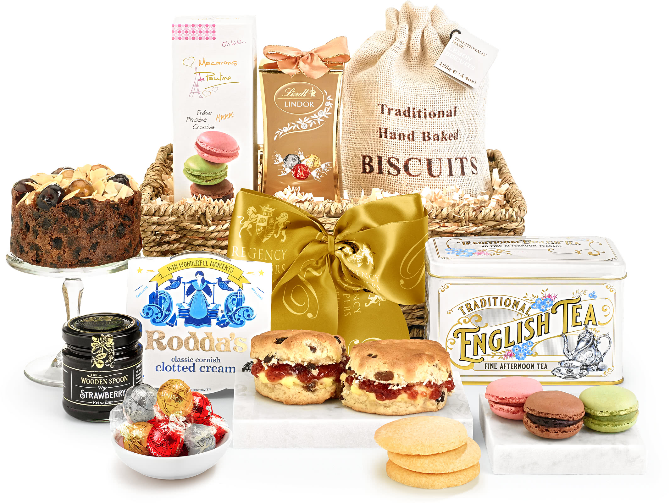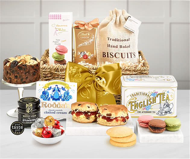 Indulge in the Ultimate Afternoon Tea Hamper, a sumptuous collection of biscuits and treats that will elevate any tea-time experience. This luxury hamper arrives in a hand-woven organic seagrass tray, perfect for serving and displaying these delectable goodies. The Ultimate Afternoon Tea Hamper is brimming with an assortment of sweet and savoury delights. Savour the Farmhouse Biscuits honey & oat biscuits, nestled in a charming hessian bag, alongside the delicate Forum strawberry, pistachio and chocolate macarons. Spread some Wooden Spoon strawberry extra jam on the sultana scones, and don't forget to add a dollop of Rodda's Cornish clotted cream for that authentic afternoon tea experience. For those with a penchant for biscuits and cakes, this hamper doesn't disappoint. The Cotswold Gourmet round Dundee cake offers a rich, fruity flavour that pairs wonderfully with a steaming cup of New English Tea's traditional English blend, presented in a charming white tin. Whether it's for a birthday celebration or simply to brighten someone's day, the Ultimate Afternoon Tea Hamper is an ideal choice. Add a decorative ribbon for that extra special touch, and let the recipient unwrap a world of teatime indulgence. This biscuit hamper is the perfect way to recreate the quintessential British afternoon tea experience in the comfort of one's home. From the first sip of tea to the last crumb of biscuit, every moment will be a delight. Can't find the perfect hamper? Why not "Create your Own" bespoke hamper, to ensure the lucky recipient has the perfect mix of products?