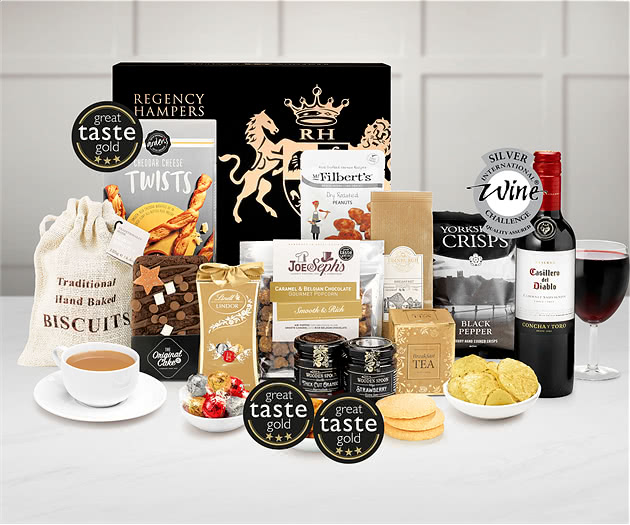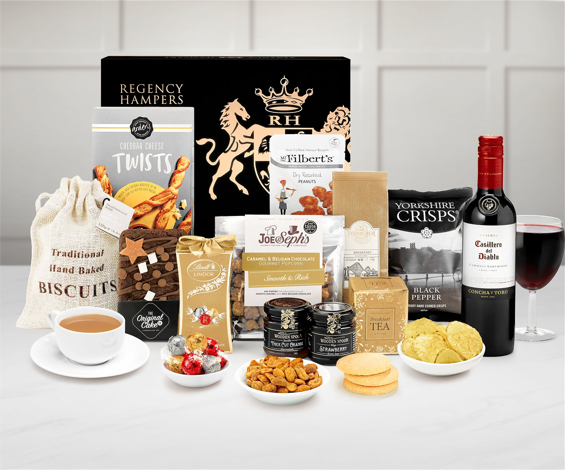 Discover the ultimate indulgence with the Wharton Hamper With Red Wine, a stunning collection of handpicked gourmet treats presented in a Regency-branded decorative postal outer. Suitable for any occasion, this hamper is perfect for sending as a gift to a loved one or a friend, with the option of UK delivery to your preferred date.