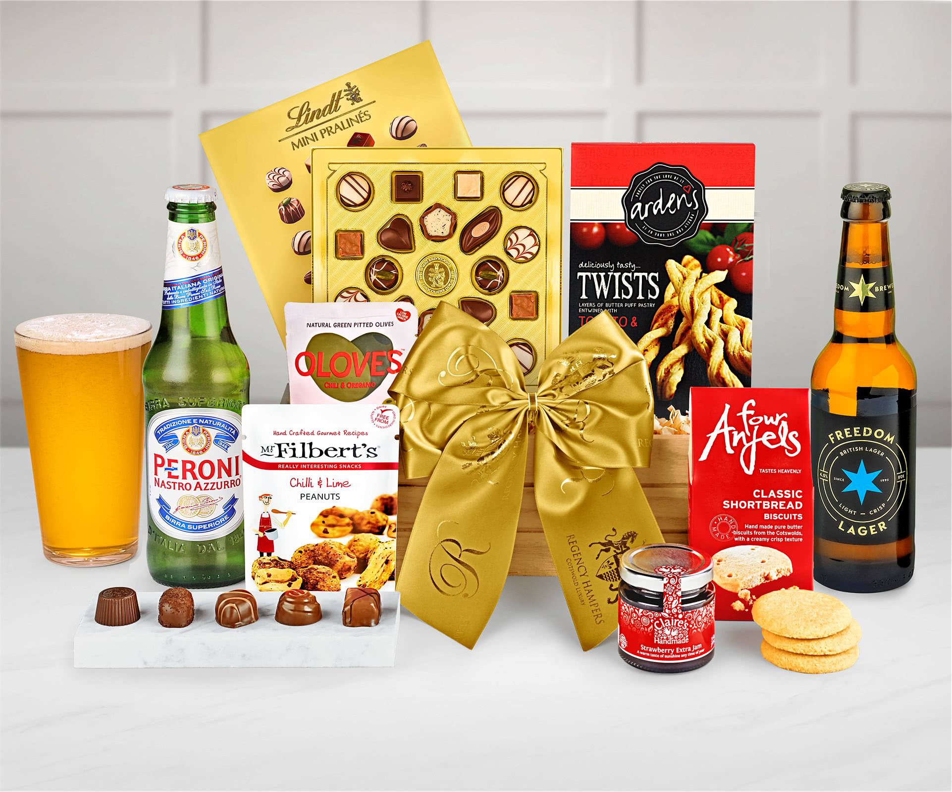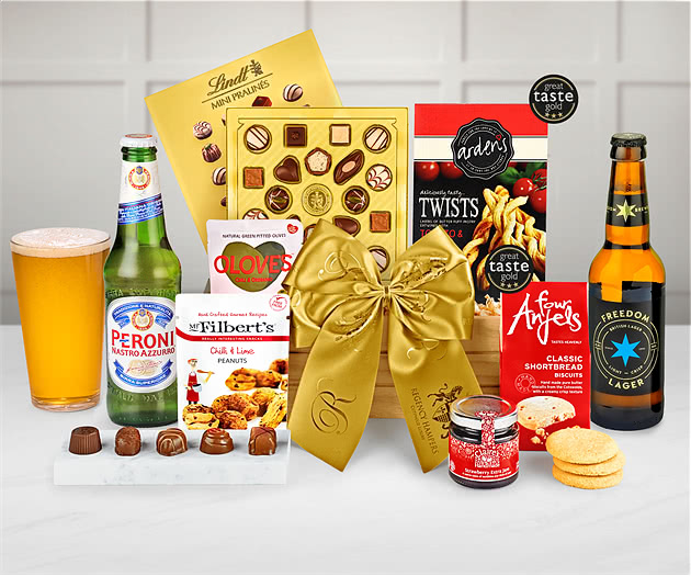 The Whittington Wooden Box with Lager Beer is a stylish wooden crate packed with continental-style lagers together with a delightful mix of savoury snacks and sweet treats to enjoy with these excellent bottles of beer. This elegant gift crate contains a bottle of Hop House 13 Lager brewed in a modern continental style and a bottle of Peroni Italian Lager Beer. To complement these refreshing lager beers we add a selection of savoury delights with flavoursome Chilli and Oregano Olives and The Dorman's ‘Perfectly Scrumptious' spicy peanuts. Sweet pleasures feature Cotswold Luxury Shortbread and Claire's Handmade Strawberry Jam while for pure chocolate pleasure we add a delicious box of Thornton's Classic Collection Chocolates. Select your preferred date for delivery of this Lager Beer gift when you place your order online when you can also add your own personalised greetings message.