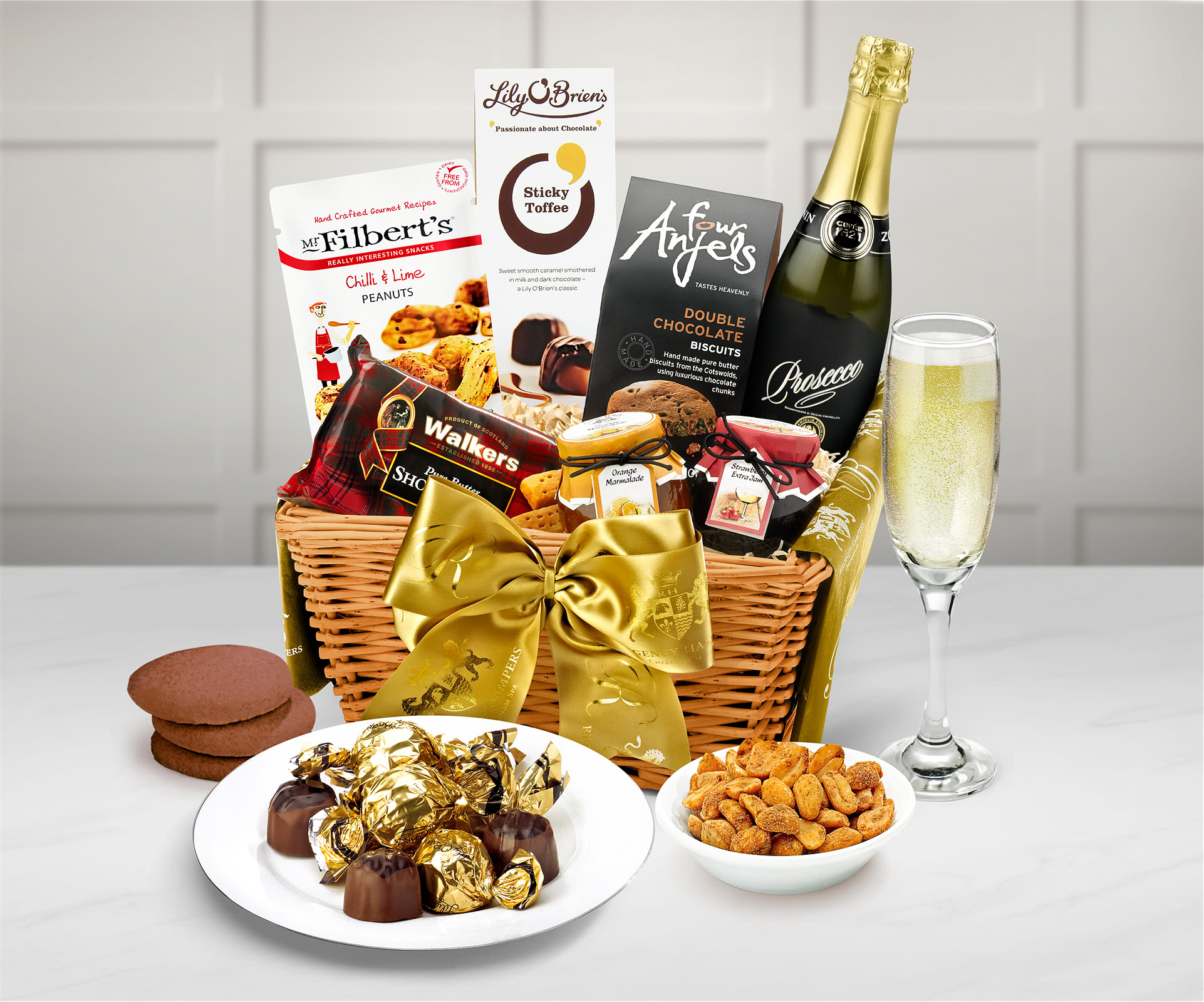 Within this Windermere Hamper with Prosecco you'll find a superb example of this celebrated sparkling Italian wine plus a delightful selection of both savoury and special sweet treats from spicy peanuts to tempting chocolates. The bottle of Prosecco in this Windermere gift hamper is a Zonin 1821 Prosecco Doc Spumante. This famous sparkling wine gets its name from the village of Prosecco near Trieste in Italy and by tradition this sparkling wine must be made with at least 85% Glera grapes from this wine-growing region. As a savoury treat we include a pack of ‘Perfectly Scrumptious' Spicy Peanuts from The Dormen together with a variety of sweet delights including Four Anjels Double Chocolate Biscuits and Walkers Pure Butter Shortbread Fingers. Within this attractive wicker tray you'll also find jars of Cottage Delight's Strawberry Jam and Orange Marmalade together with Lily O'Brien's delicious Sticky Toffee Chocolates. Your Windermere Hamper with Prosecco is hand-wrapped and tied with a beautiful golden ribbon plus you can include your own personal greetings message when you order this present online.