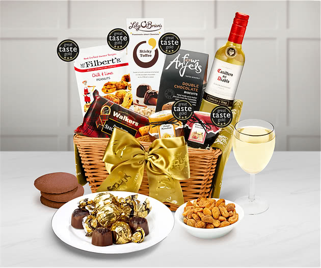 Inside this Windermere Hamper with White Wine you'll discover a superb bottle of Chilean white wine Italian wine to which we add a delightful mix of savoury and sweet treats including spicy peanuts and tempting chocolates. The Casillero del Diablo bottle of Sauvignon Blanc white wine in this Windermere gift hamper comes from these celebrated Chilean vineyards. To accompany this fine wine we provide a pack of ‘Perfectly Scrumptious' Spicy Peanuts from The Dormen together with a variety of sweet delights. For example, within this attractive wicker tray you'll also find Four Anjels Double Chocolate Biscuits and Walkers Pure Butter Shortbread Fingers plus jars of Cottage Delight's Strawberry Jam and Orange Marmalade together with a delicious packet of Lily O'Brien's Sticky Toffee Chocolates. Your Windermere Hamper with White Wine is hand-wrapped and tied with a beautiful golden gift ribbon. You can add your own personal greetings message when you order this present online.
