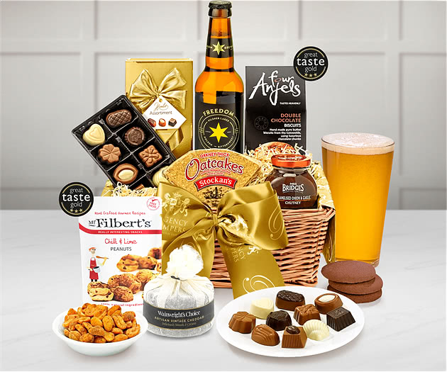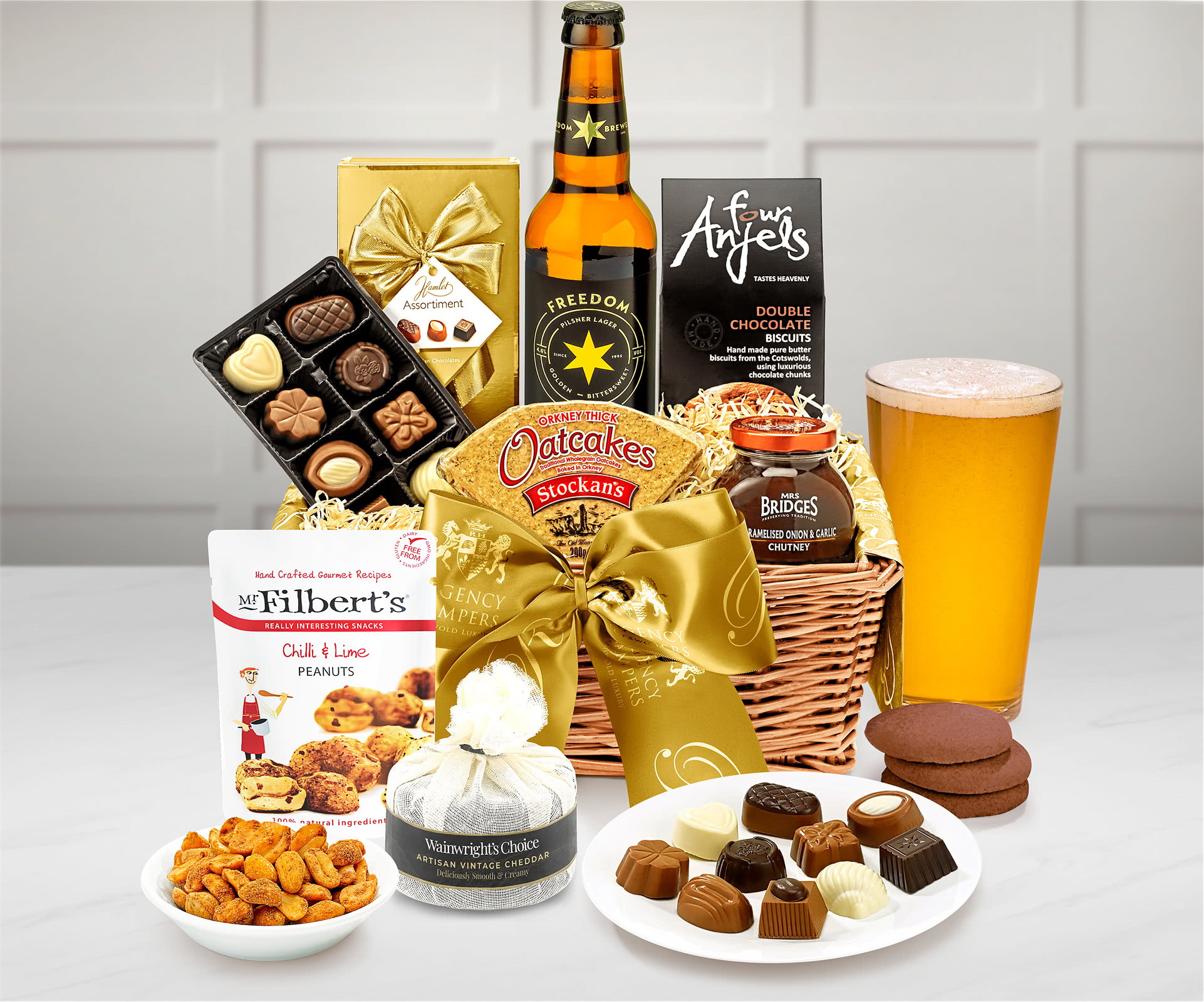 For the beer connoisseur, we've included a 330ml bottle of Freedom Brewery's "Freedom" Pilsner Lager, a crisp and refreshing choice that is sure to be enjoyed. And no beer gift hamper would be complete without a selection of snacks to nibble on while sipping. Wainwright's Choice Black Waxed Farmhouse Cheddar in Muslin Cloth provides a savoury contrast to the sweet and sticky Lily O'Brien's Sticky Toffee Chocolates in Pouch. Stockan's Orkney Thick Oatcakes and Filbert's Chilli & Lime Peanuts round out the snack selection, offering a variety of textures and flavours to complement the beer.