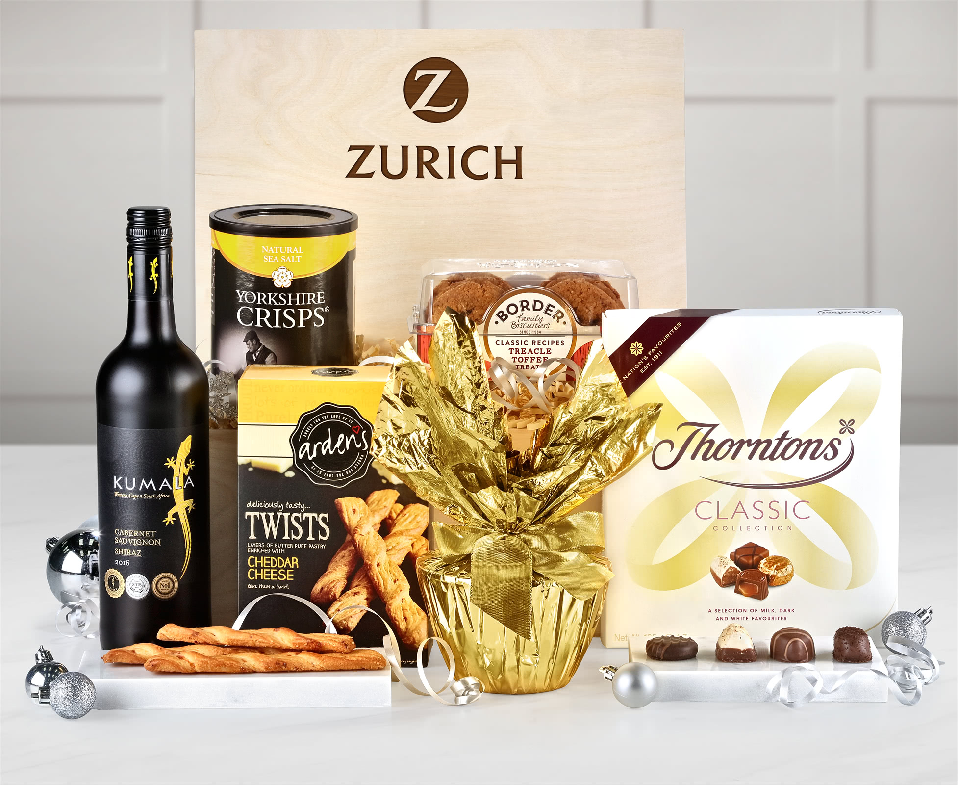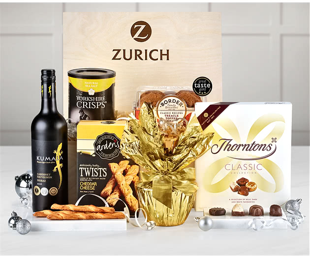 An ideal corporate gift to thank and reward colleagues and customers, this Kendal sweet and savoury gift hamper in its bespoke branded wooden chest is packed with fine food and drink including a superb red wine plus a selection of food treats.