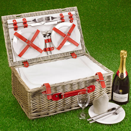 This four person fitted picnic hamper is lightweight and easy to carry. This timeless picnic hamper is hand-woven from willow and features high quality red faux leather straps & handle. The hamper contains a large chillier compartment, to help ensure your food arrives in perfect condition. It also benefits from a set of porcelain plates and cutlery for four place settings. This should mean you are now ready to picnic, as soon as the sun appears! . Please note that all contents have been fairly described and photographic props such as wine bottles or picnic blankets are not included unless stated.