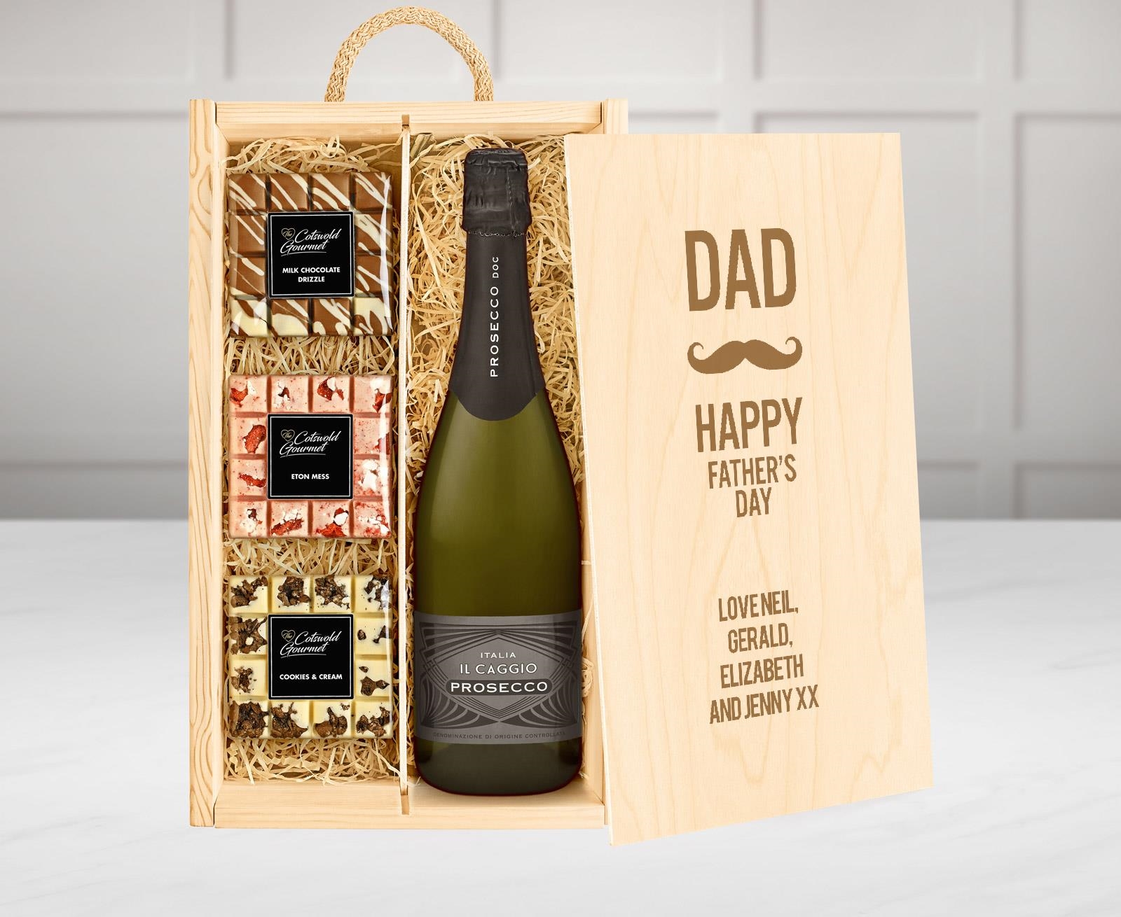 Our Chocolate & Prosecco Tasting Experience Gift Box pairs premium Prosecco from the Veneto wine-growing region of Italy with luxury chocolates by The Cotswold Gourmet, exclusively hand-made and specially-chosen for their complementary flavour profile. The three-strong tasting ensemble includes Cookies & Cream', 'Eton Mess' and Milk Chocolate Drizzle varieties alongside Il Caggio's 75cl sparkling Prosecco, all arranged in a wooden presentation case which can be personalised with your choice of occasion-specific design, themed gift-ribbon and greeting message. '.