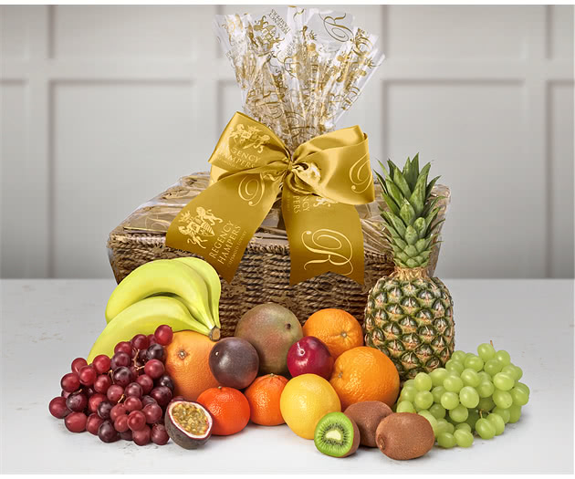 This attractive willow tray is packed to overflowing with fresh tropical fruit including pineapple, kiwi fruit, mango and oranges. You'll also find among this delightful display of tropical fruit, grapefruit, lemon and plum as well as bunches of red and green grapes. This fresh fruit basket is a wonderful way to say Get Well Soon for anyone who's feeling under the weather. It can also be used to welcome friends and family members to a New Home. The Regency Fresh Fruit Basket is also a healthy alcohol-free present and a fruitful sharing gift to thank and reward work colleagues.