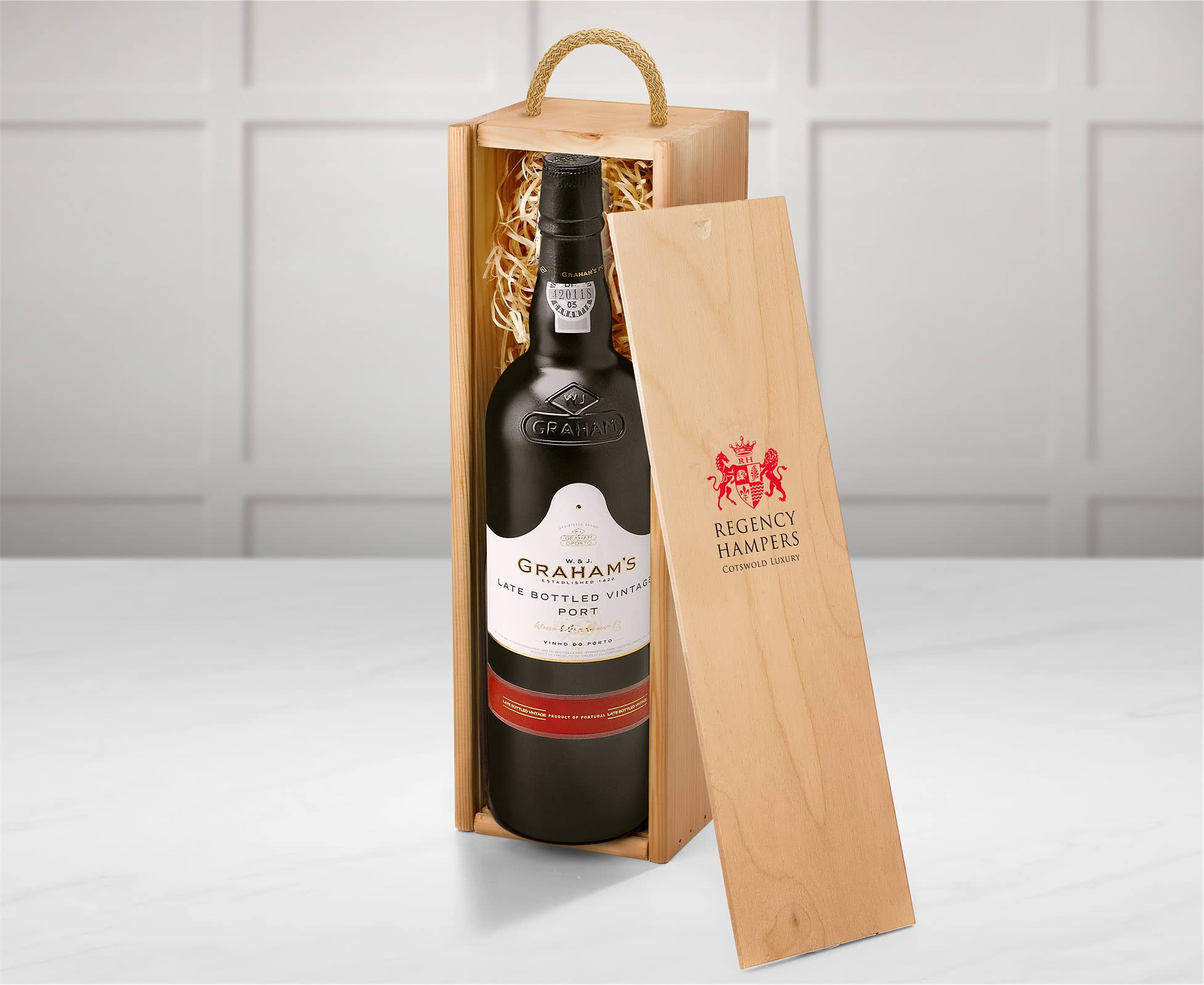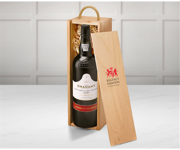 Port has a long association with celebrations and is a popular choice to drink with cheese at the end of a meal. Regency Hampers therefore offer you an ideal traditional gift with this Graham's LBV Port in Wooden Box. Inside an elegant wooden case, complete with sliding lid branded with the Regency Hampers logo, you'll find an exceptional bottle of Graham's Late Bottled Vintage Port. This rich red fortified wine, of which Graham's Vintage Port is a fine example, adds sophistication to any special occasion or important event. Your gift of Graham's Late Bottled Vintage Port in its attractive wooden box is hand-wrapped and tied with a beautiful golden ribbon. You can also include your own personal greetings message.