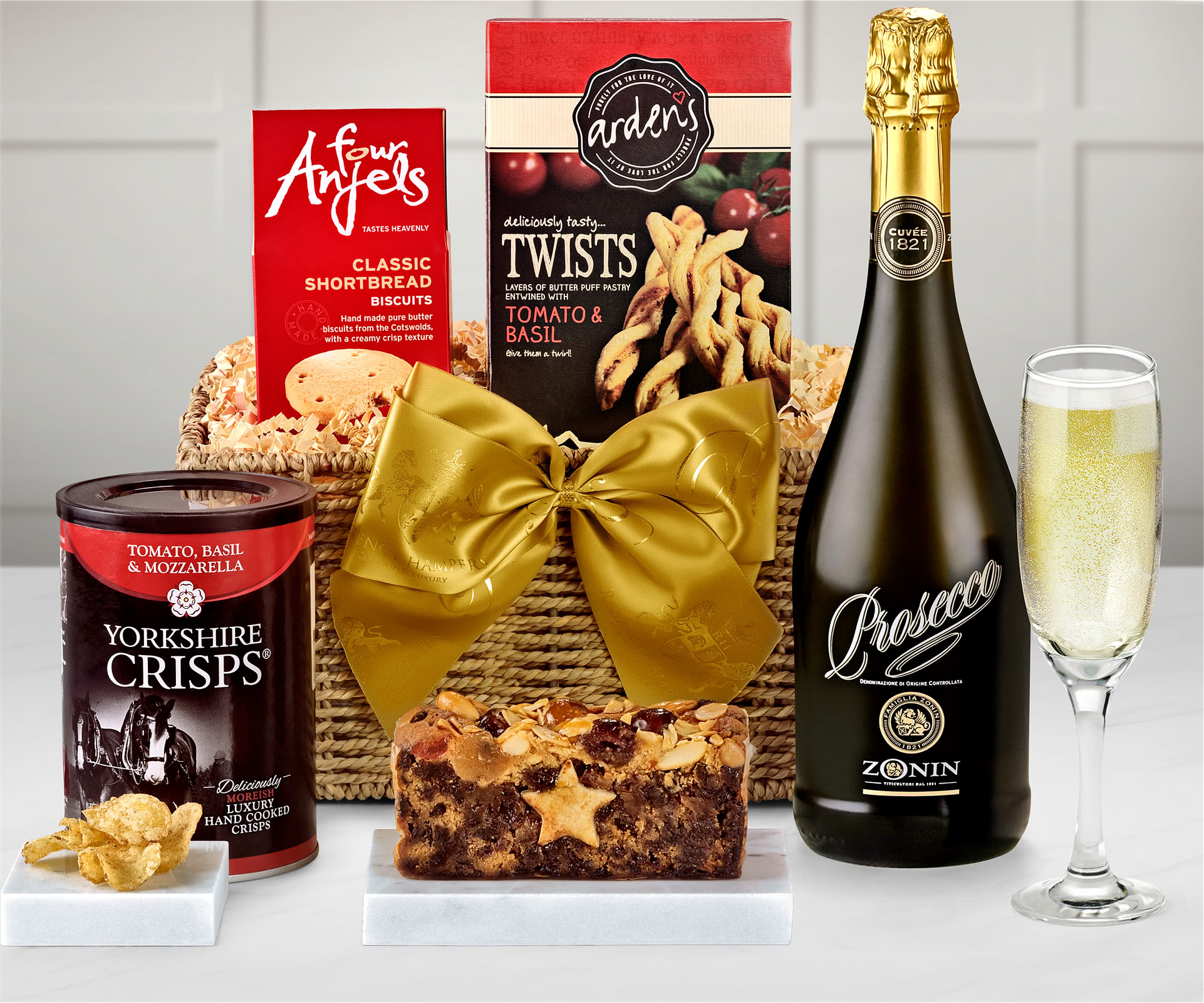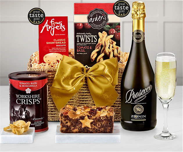 The perfect present for anyone who appreciates the finest Italian sparkling white wine as we include a superb bottle of Prosecco plus a selection of savoury and sweet items to mark any special occasion. Our Clarendon Hamper with Sparkling Prosecco includes Zonin 1821 Prosecco Doc Spumante Special Cuvee accompanied by a range of choice food treats in a stylish seagrass tray. Savoury snacks include Tomato, Basil and Mozzarella Crisps plus a pack of Tomato & Basil Puff Pastry Twists that go so well with the sparkling Prosecco in this Clarendon Hamper. Sweet items include Cotswold Luxury Shortbread and a rich Fruit & Nut Slab Cake decorated with a marzipan star and icing sugar dusting from The Cotswold Gourmet. Gifts from Regency Hampers are beautifully packed and presented. This Clarendon Hamper in its elegant seagrass tray arrives decorated with a golden hand-tied ribbon and you can include your own personalised message. As this gift hamper contains alcohol it is not suitable for under 18s.