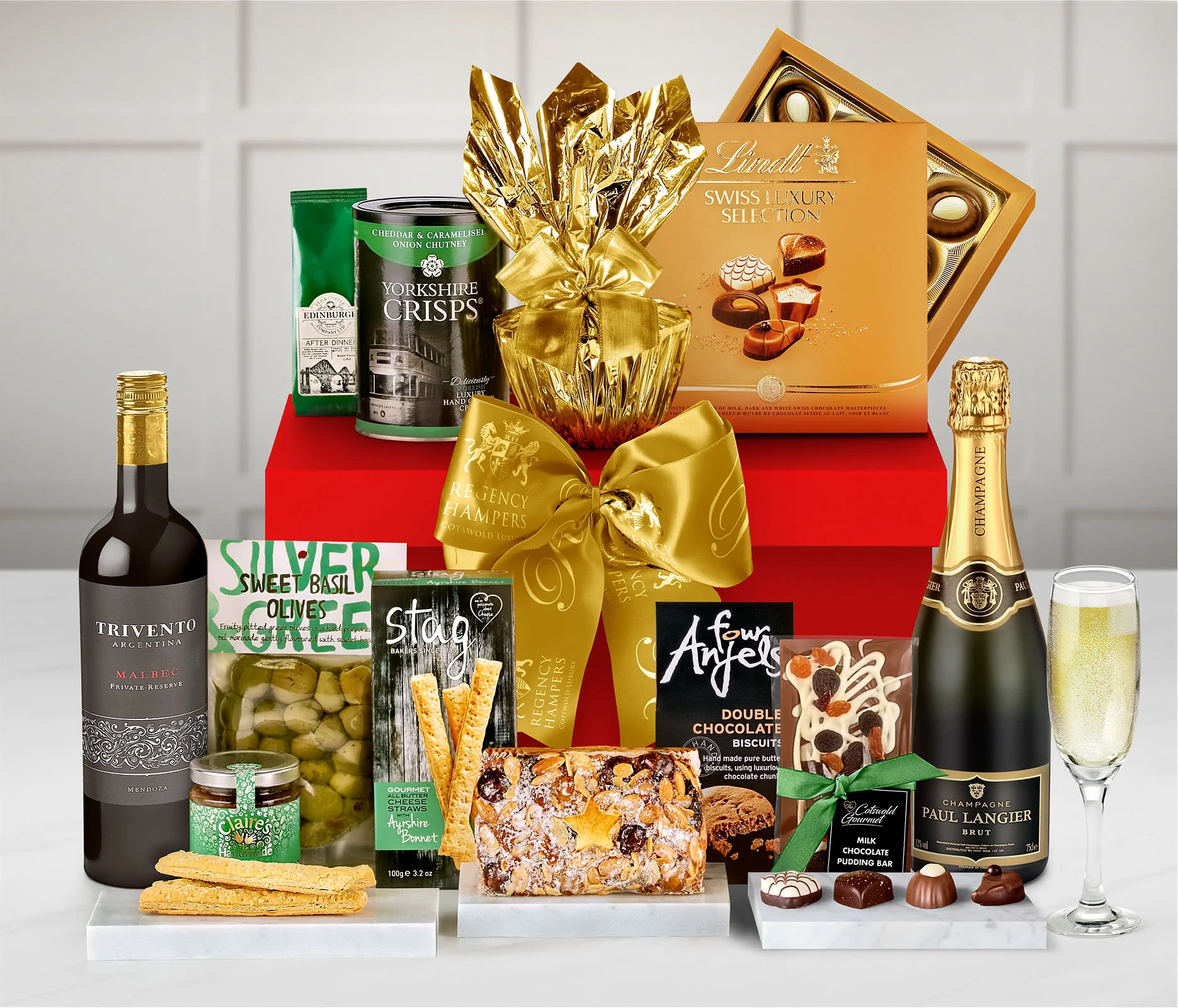 If you're seeking something even more spectacular, consider the Festive Surprise Gift Box with Champagne and Red Wine. This show-stopping hamper includes both Paul Langier Brut Champagne and Trivento Private Reserve Malbec, accompanied by luxuries like Silver & Green Sweet Basil Olives and The Original Cake Company's Luxury Jewel Topped Fruit Cake. It's the sort of gift that makes a statement without you having to say a word.