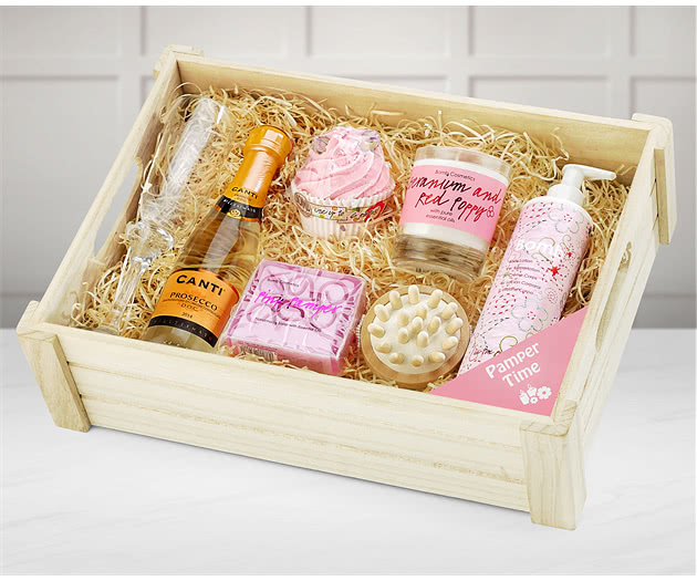 The perfect way to pamper the ladies in your life. This version of our Pink Pamper Crate contains a fabulous gift bottle of San Leo Brut Prosecco Italian Sparkling White Wine plus an elegant Flute Wine Glass as well as a choice selection of luxurious pamper presents. Inside an elegant wooden crate (which can be reused as a stylish way to store bathroom toiletries) you'll find a romantic and relaxing Bomb Cosmetics Geranium & Red Poppy Candle, together with a series of excellent bath-time pampering gifts. In addition to Bomb Cosmetics Pink Pamper Soap and In The Pink Body Lotion we include a delightful Bath Brulee for a full-on pampering session accompanied by a fine glass of Sparkling Italian Wine. And after all that relaxation you can enliven and stimulate your skin with a handy Detox Brush and Massager. This Pink Pamper Crate with Sparkling Wine is a lovely gift for a woman and is beautifully packaged to add to the glamorous presentation with a romantic golden ribbon tied in a bow.